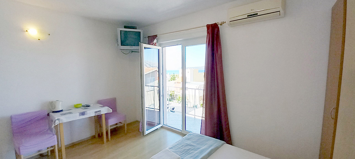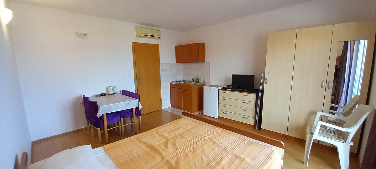 obývací pokoj s malým kuchyňským koutem a manželskou postelí, sociální zařízení se sprchou, balkon s výhledem na moře