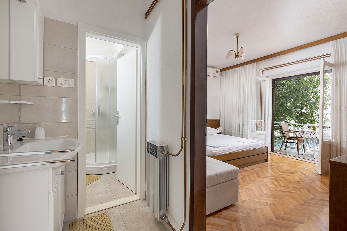 pokoj s manželskou postelí s možností přistýlky pro jednu dospělou osobu, sociální zařízení se sprchou, balkon či terasa