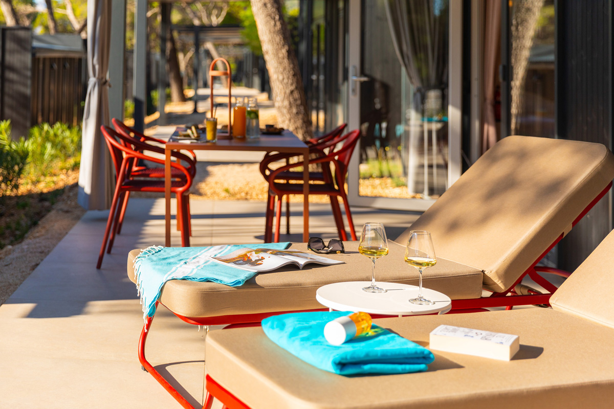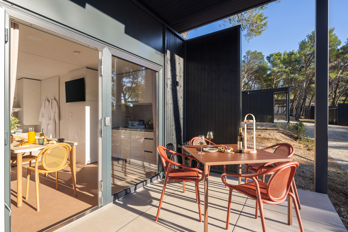 Mobile home typu premium se nachází v centrální části kempu v blízkosti bazénového komplexu a dětského hřiště.