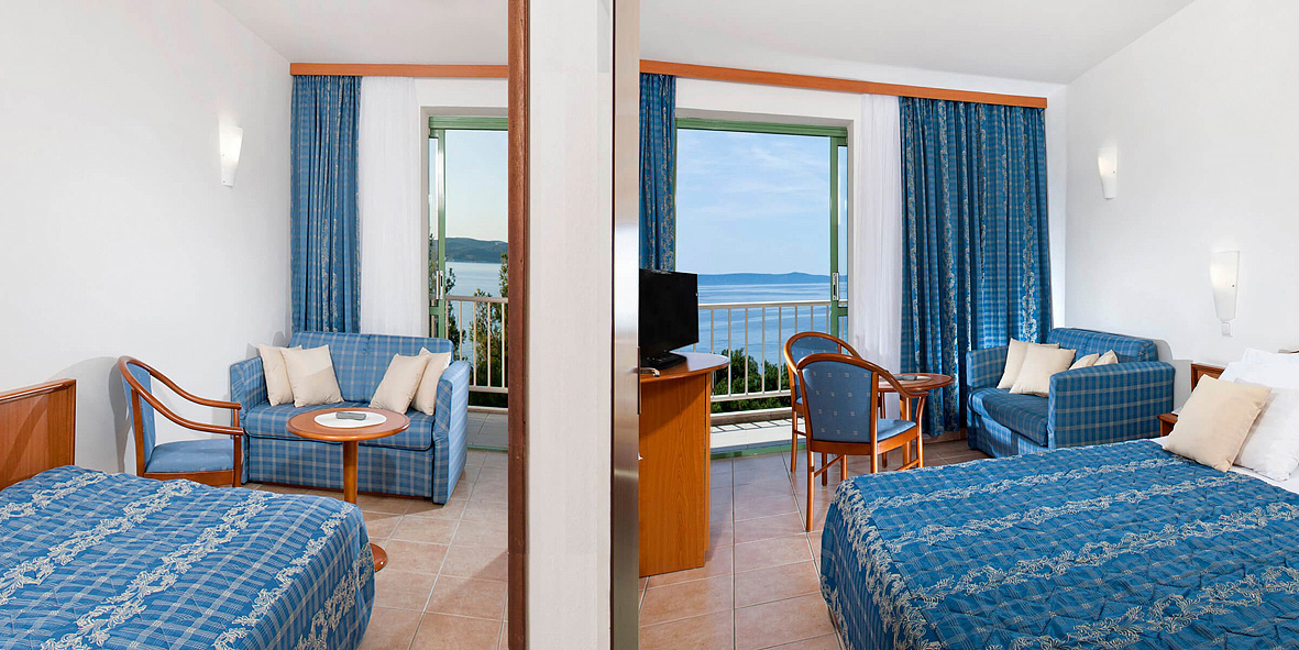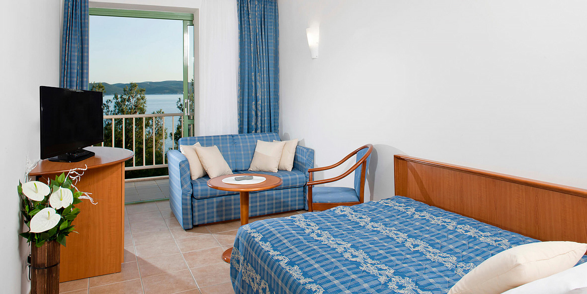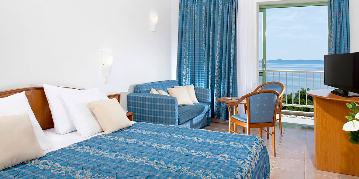 20 m² - pokoj s manželskou postelí, rozkládací gauč pro 1 osobu, sociální zařízení se sprchou, balkon orientován k moři