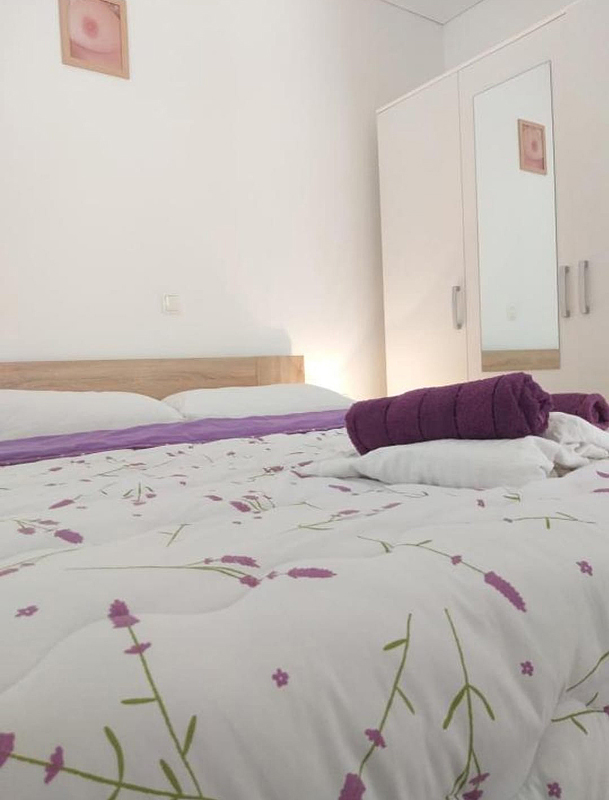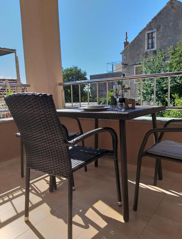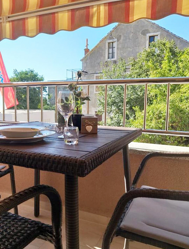 ložnice s manželskou postelí, obývací pokoj s vybaveným kuchyňským koutem a přistýlkou formou rozkládacího gauče pro jednu dospělou osobu nebo dvě děti do nedovršených 12 let, sociální zařízení se sprchou, sociální zařízení se sprchou, dva balkony - jeden orientovaný do ulice, druhý balkon s výhledem na moře