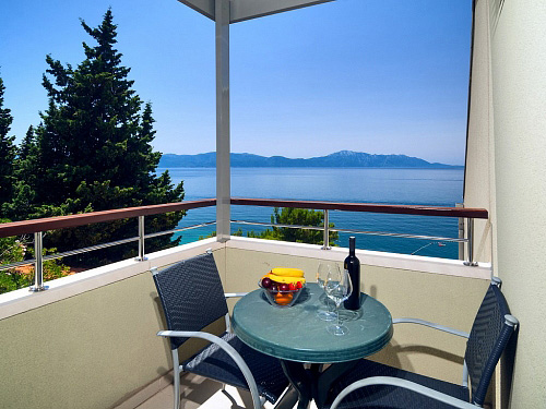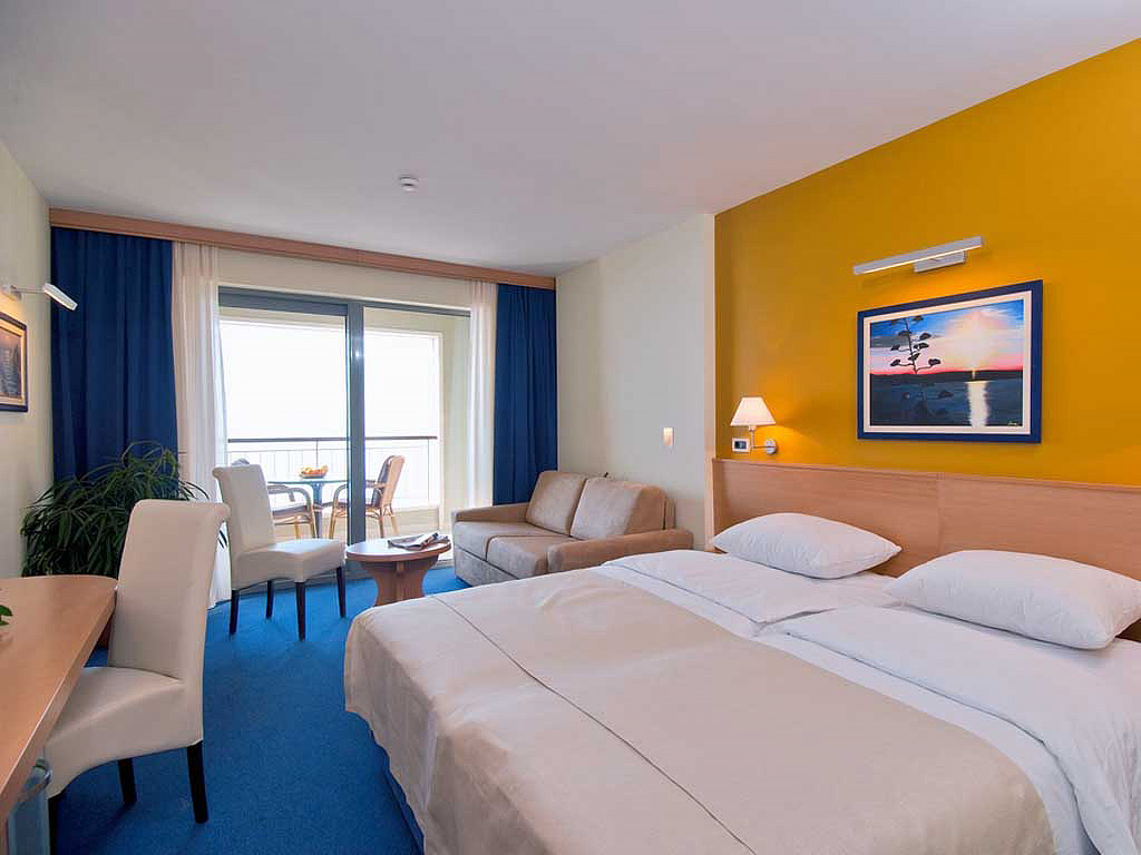 Premium 2/3 balkon M - pokoj s manželskou postelí s možností přistýlky pro jednu osobu, sociální zařízení s vanou, balkon s výhledem na moře