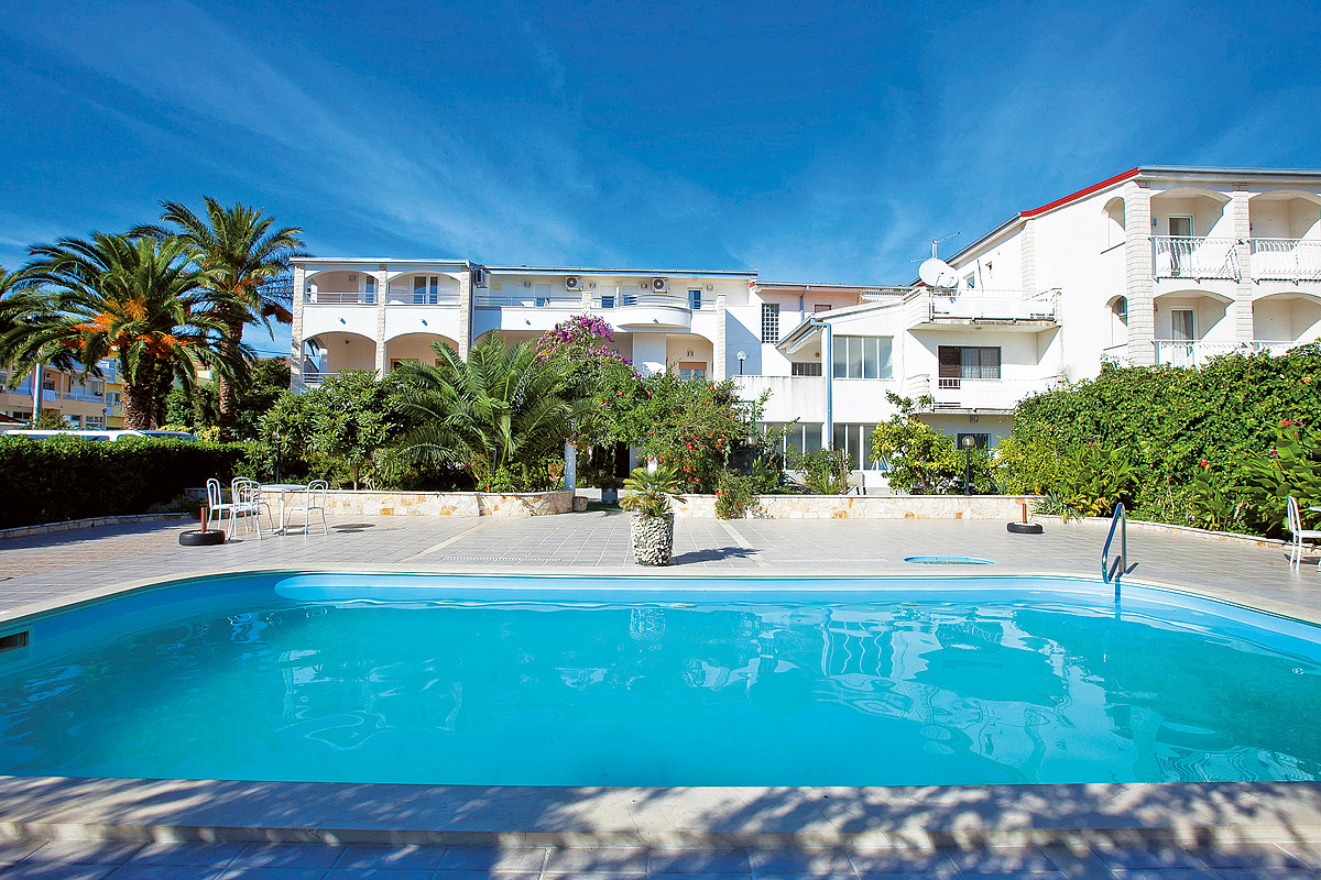 venkovní bazén (10 x 4,5 m) s posezením a slunečníky, multifunkční betonové hřiště, stolní tenis, plážová lehátka*, půjčovna jízdních kol*