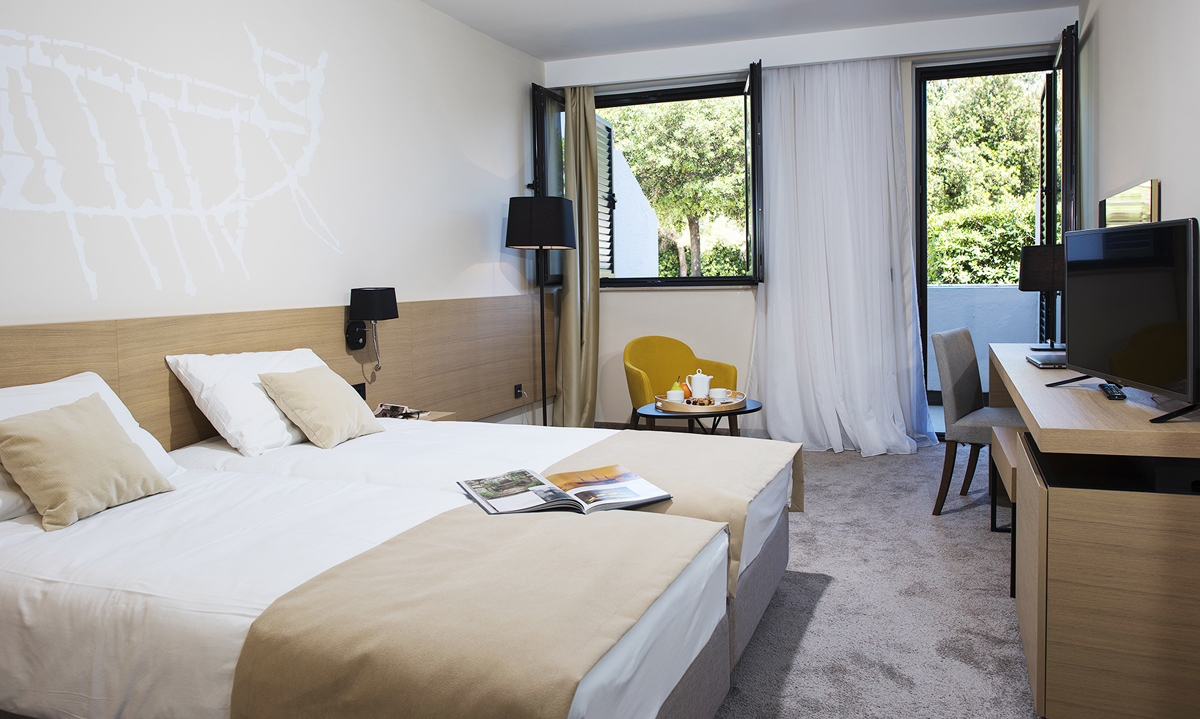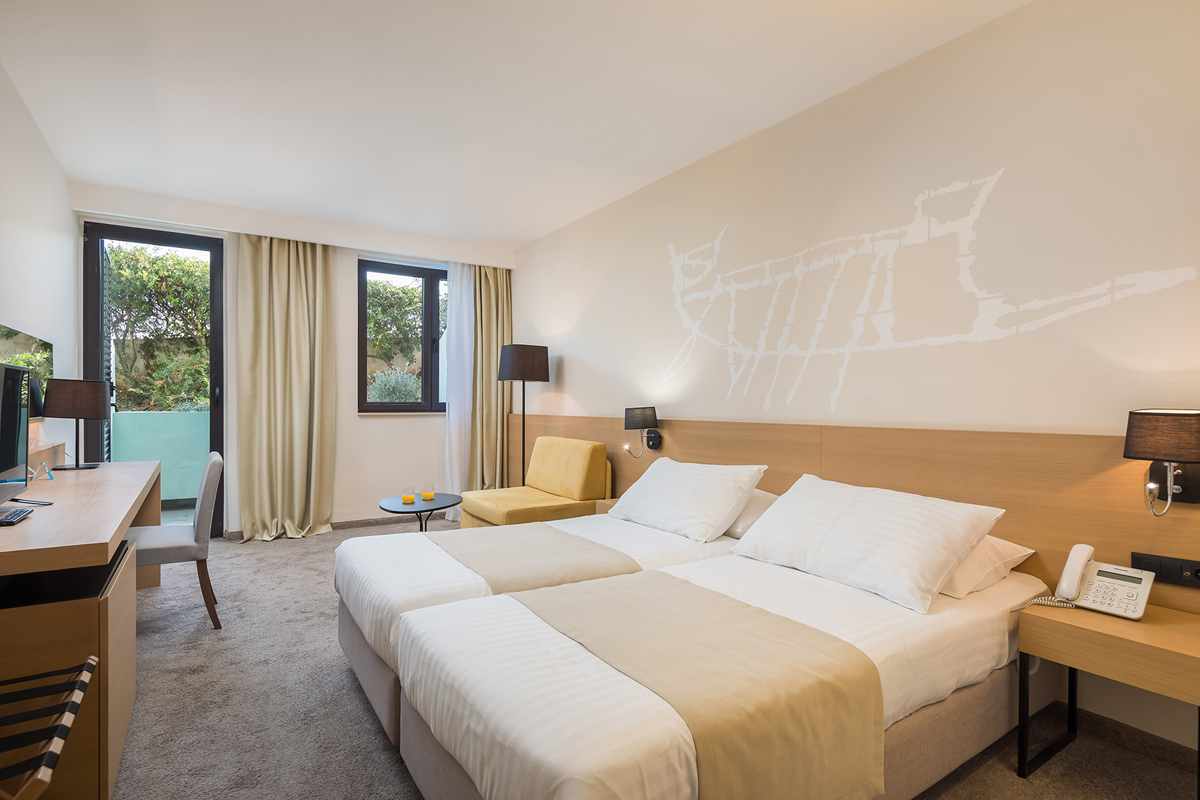 pokoj s manželskou postelí či dvěma oddělenými lůžky, rozkládací pohovka vhodná pro 1 dospělou osobu a 1 dítě do nedovršených 10 let, sociální zařízení s vanou, samostatná toaleta, balkon orientovaný na mořskou stranu; může být mezonet (pouze na vyžádání)
