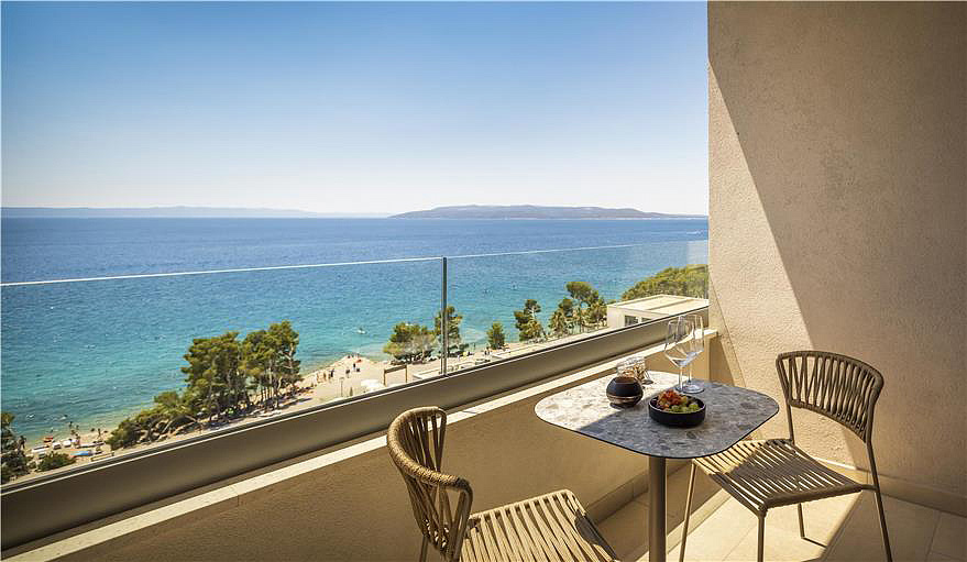 pokoj s manželskou postelí a přistýlkou formou rozkládací pohovky pro jednu osobu, sociální zařízení se sprchou či vanou, balkon s částečným výhledem na moře
