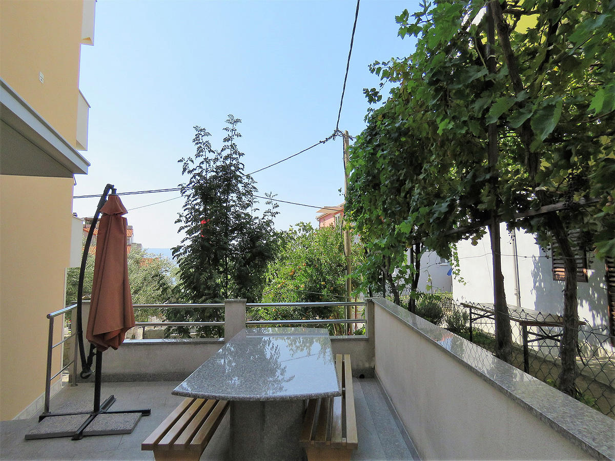 ložnice s manželskou postelí, obývací pokoj s kuchyňským koutem a rozkládacím gaučem pro 2 osoby, sociální zařízení se sprchou, balkon s výhledem na moře