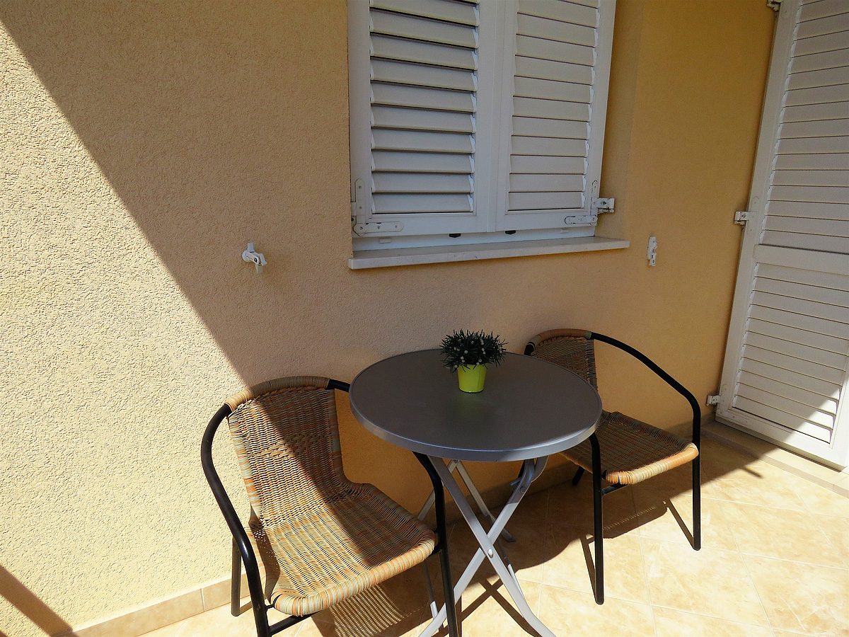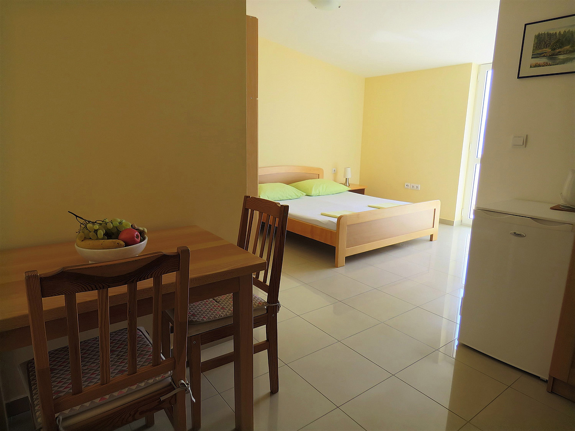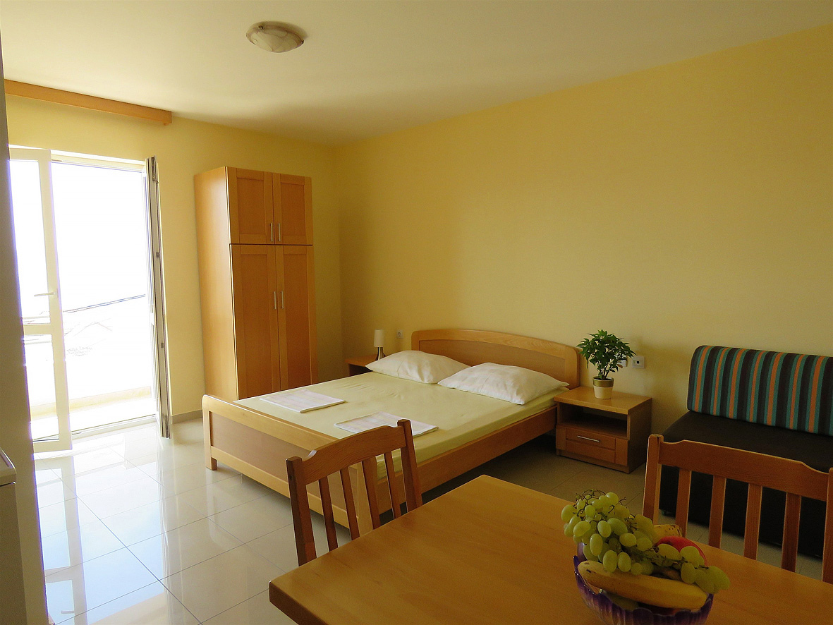 obývací pokoj s kuchyňským koutem a manželskou postelí, sociální zařízení se sprchou, možnost 1 přistýlky formou rozkládacího gauče, balkon s výhledem na moře