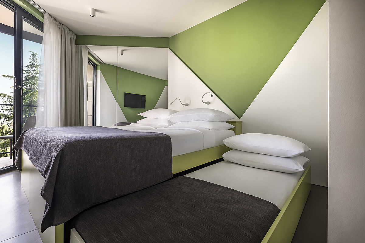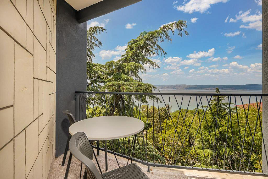 cca 18 m² - pokoj s manželskou postelí a přistýlkou formou vysouvacího lůžka pro dítě do nedovršených 15 let, sociální zařízení se sprchou, balkon s výhledem na moře