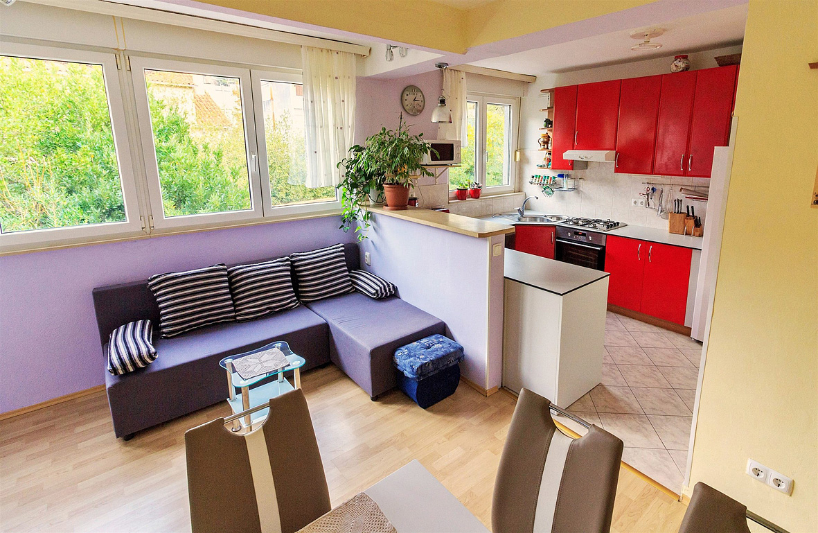 2x pokoj s manželskou postelí, obývací pokoj s kuchyňským koutem a rozkládací gauč pro 2 osoby, sociální zařízení s vanou, balkon