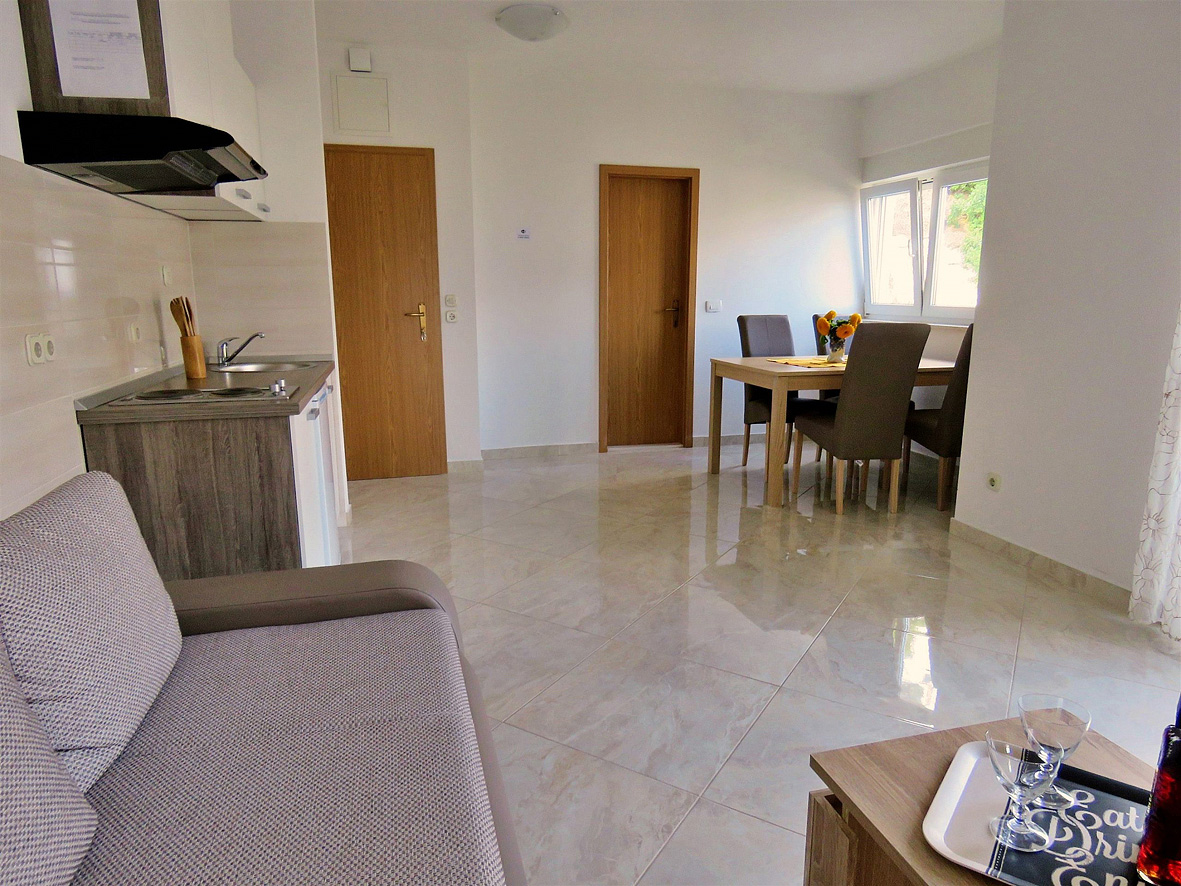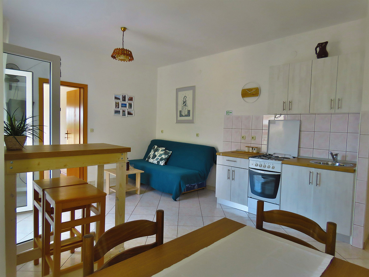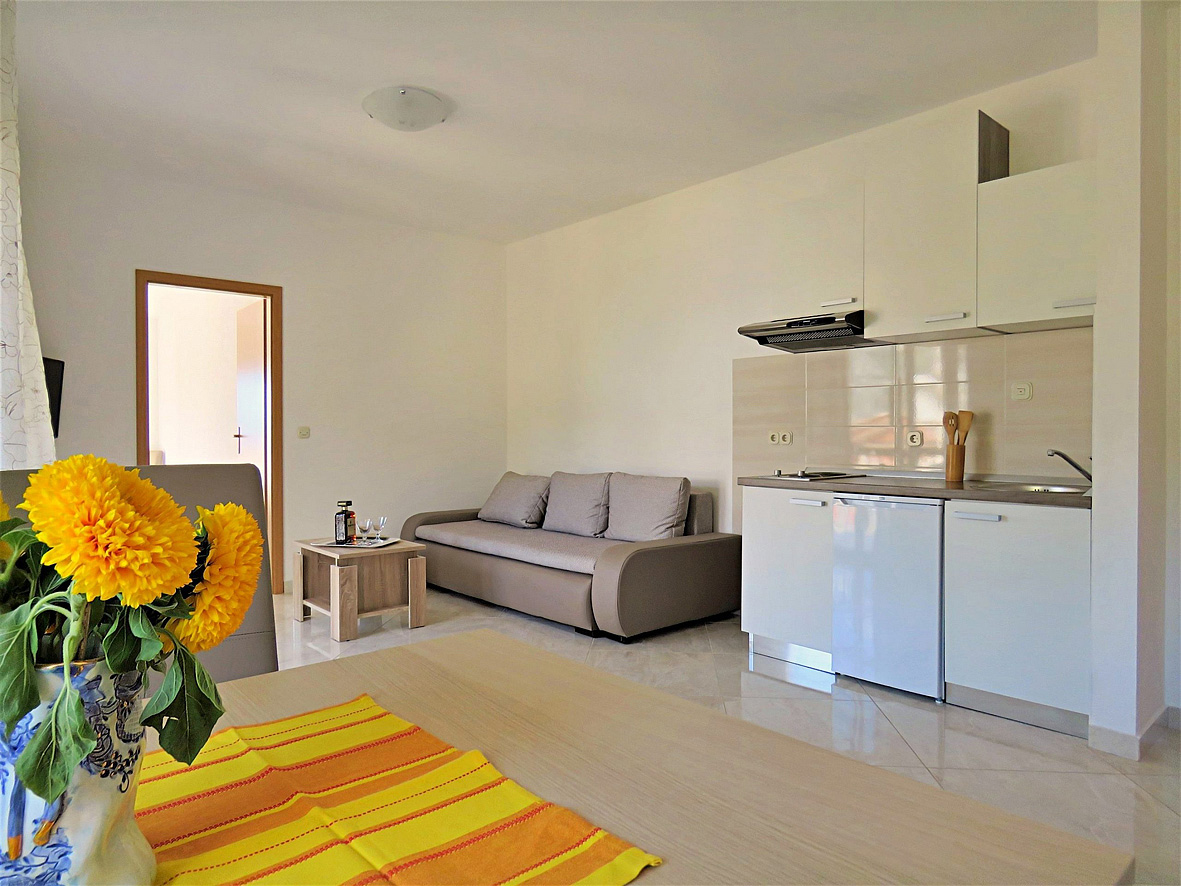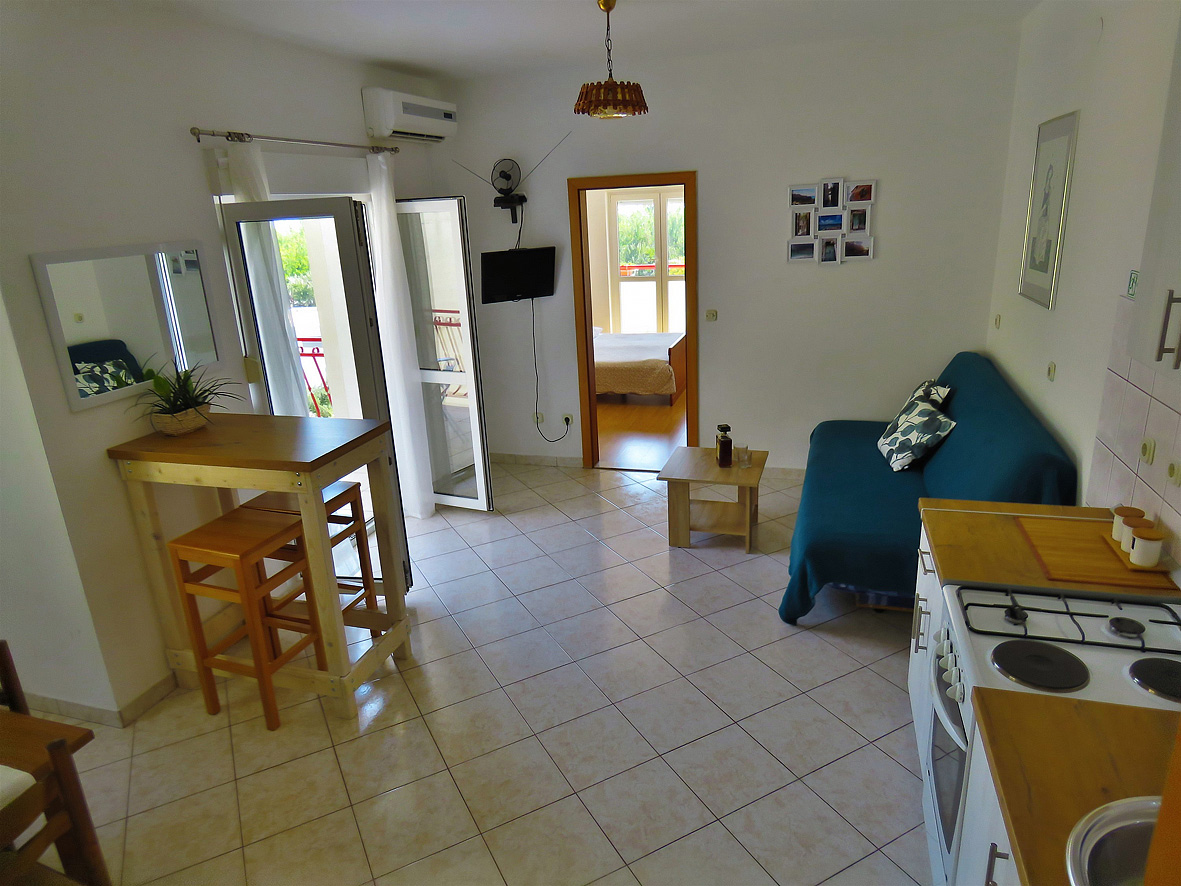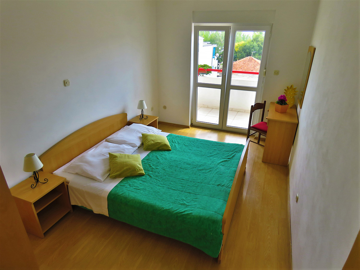 pokoj s manželskou postelí, obývací pokoj s kuchyňským koutem a rozkládacím gaučem pro 2 děti do nedovršených 15 let, sociální zařízení se sprchou, 2x balkon, jeden s výhledem na moře