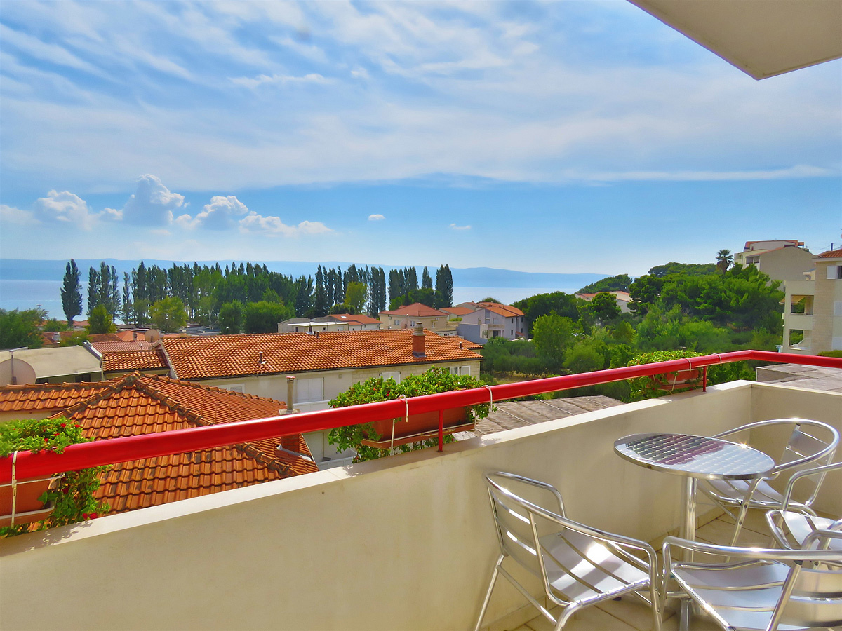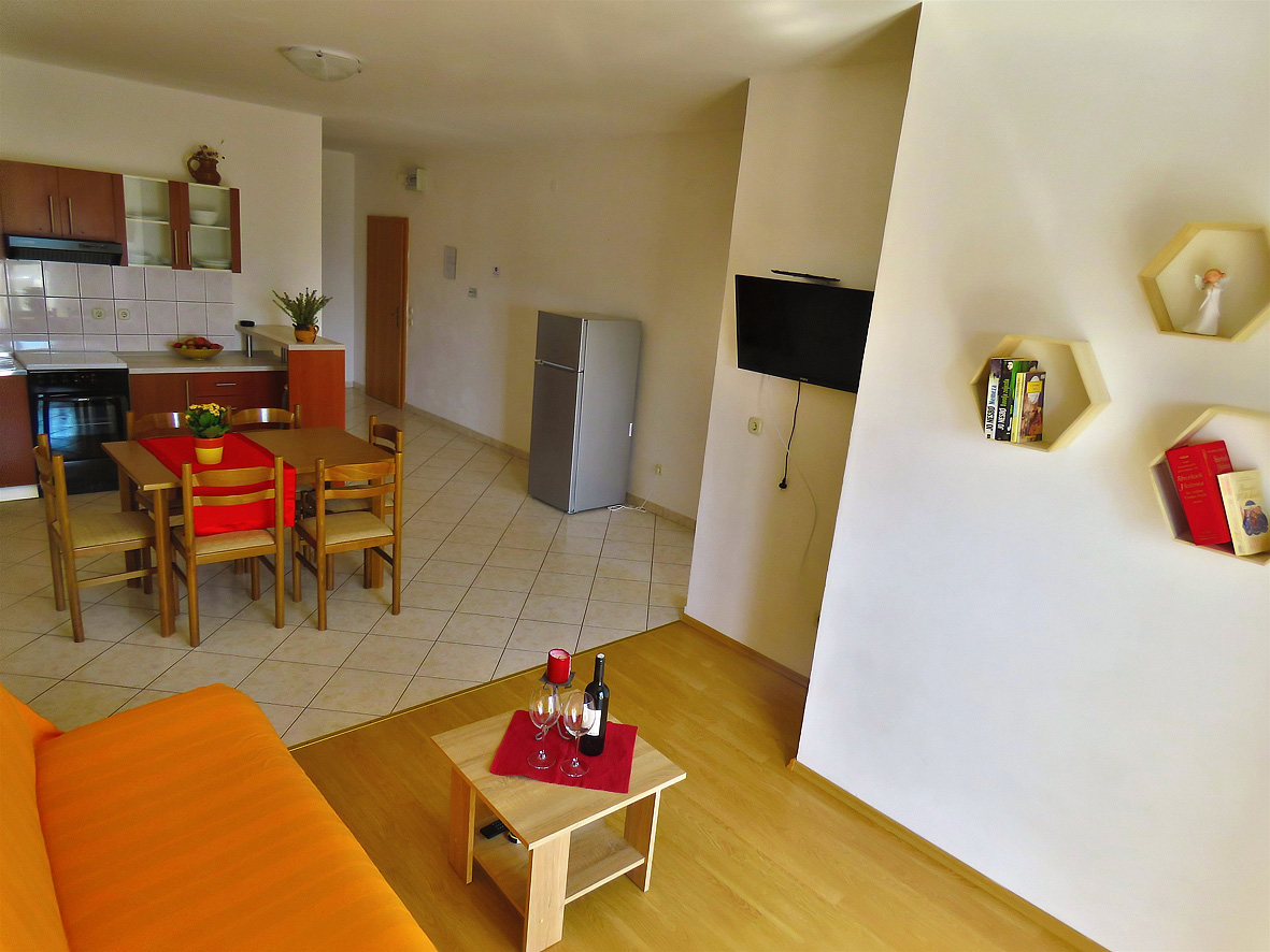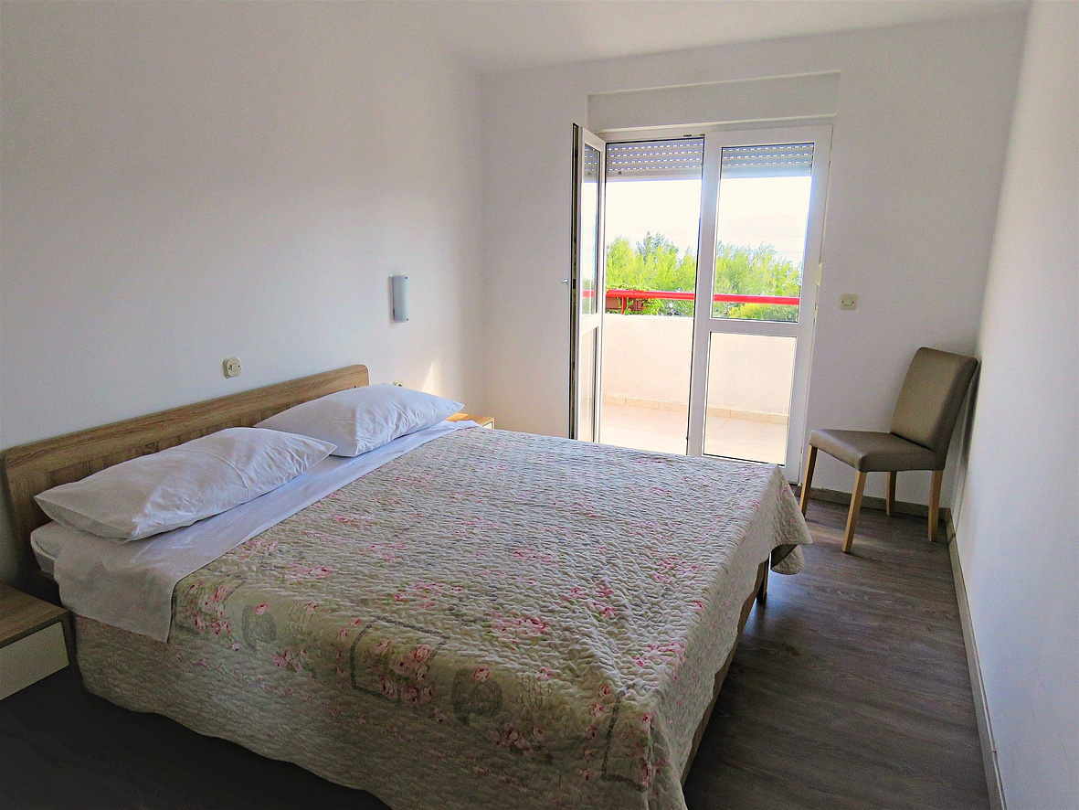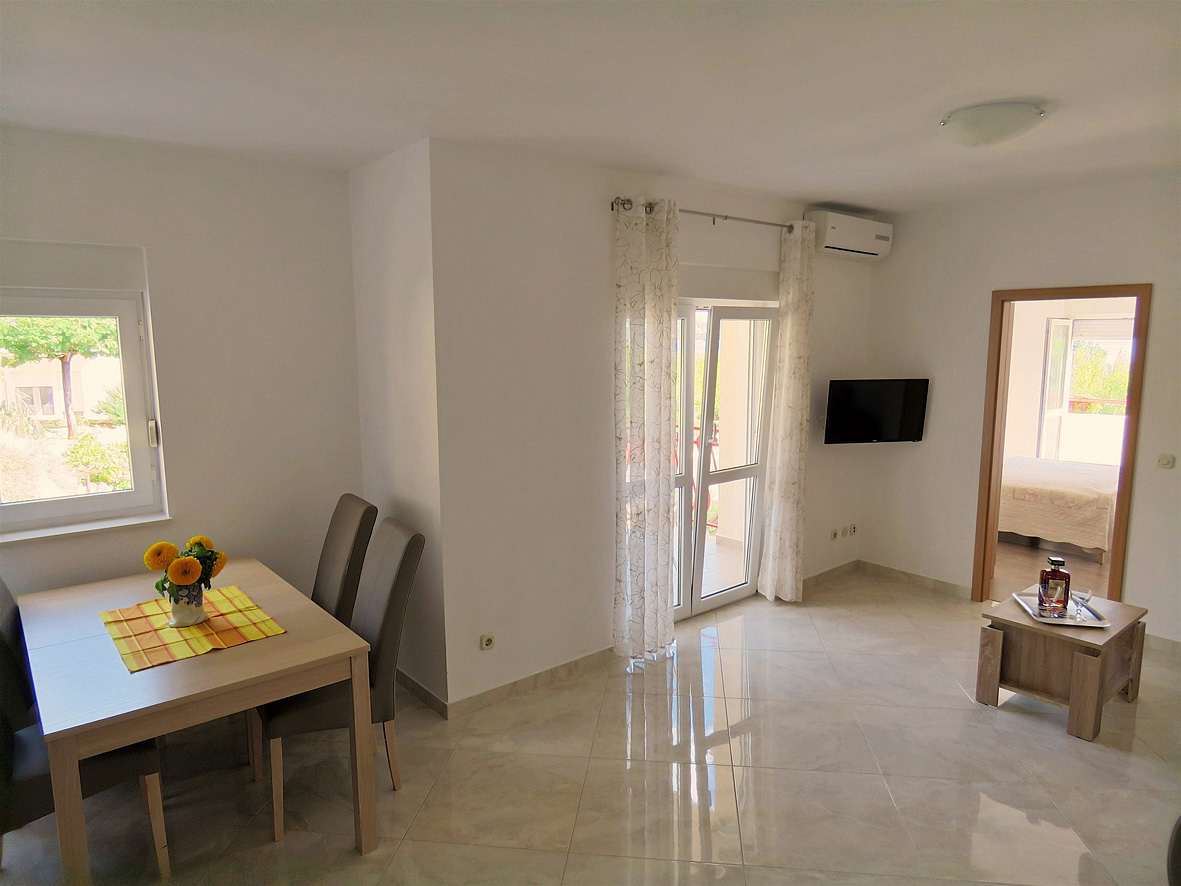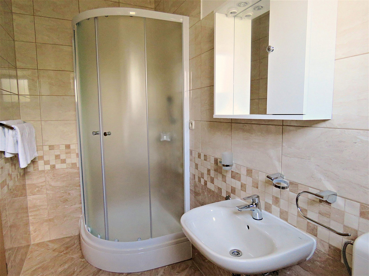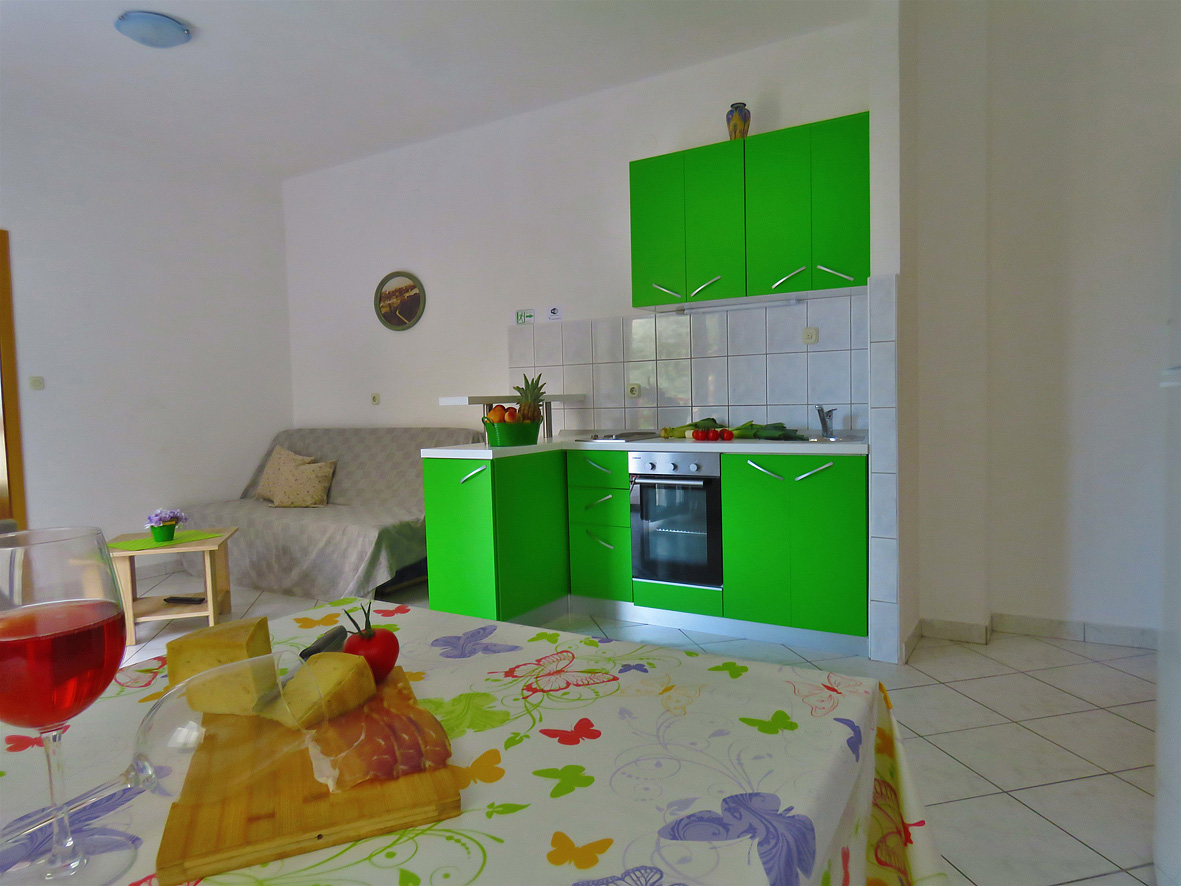 pokoj s manželskou postelí, obývací pokoj s kuchyňským koutem a rozkládacím gaučem pro 2 děti do nedovršených 15 let, sociální zařízení se sprchou, 2x balkon, jeden s výhledem na moře