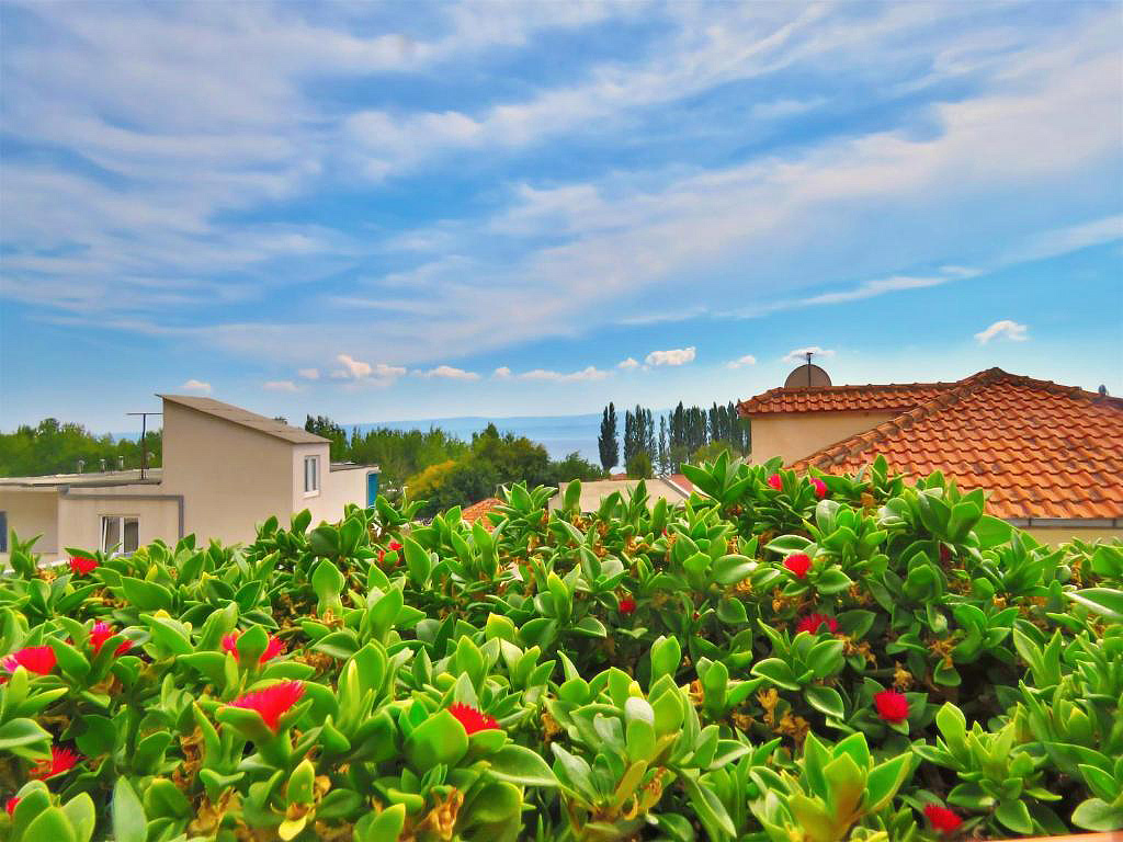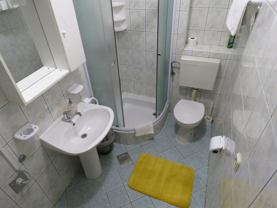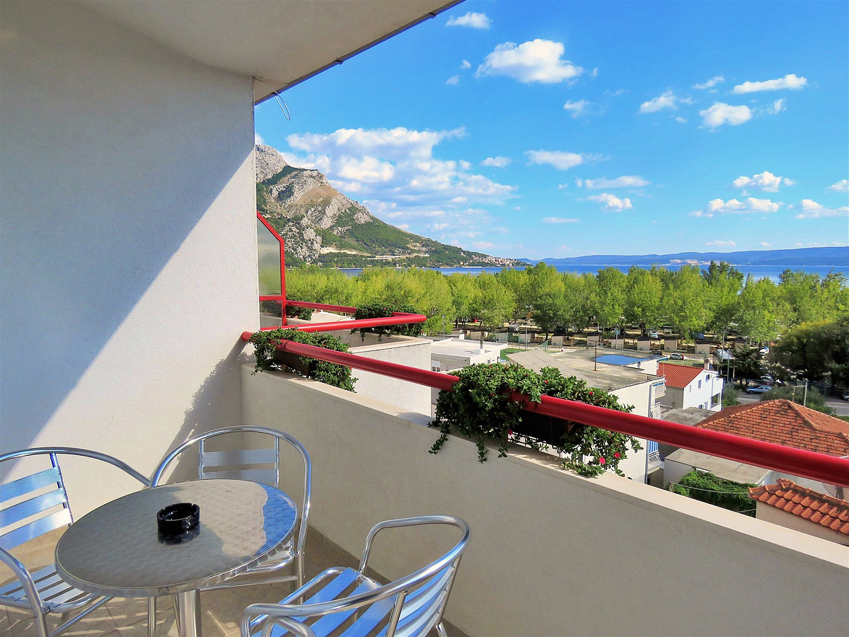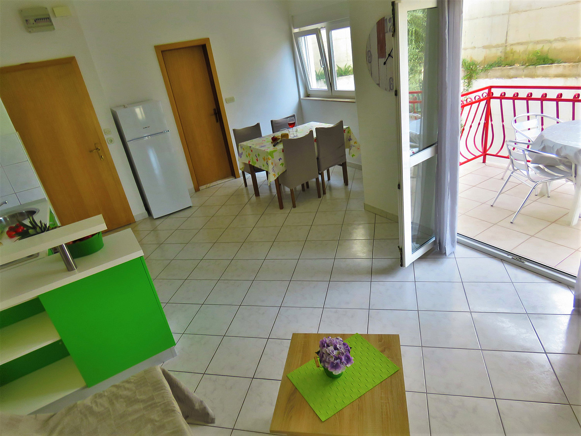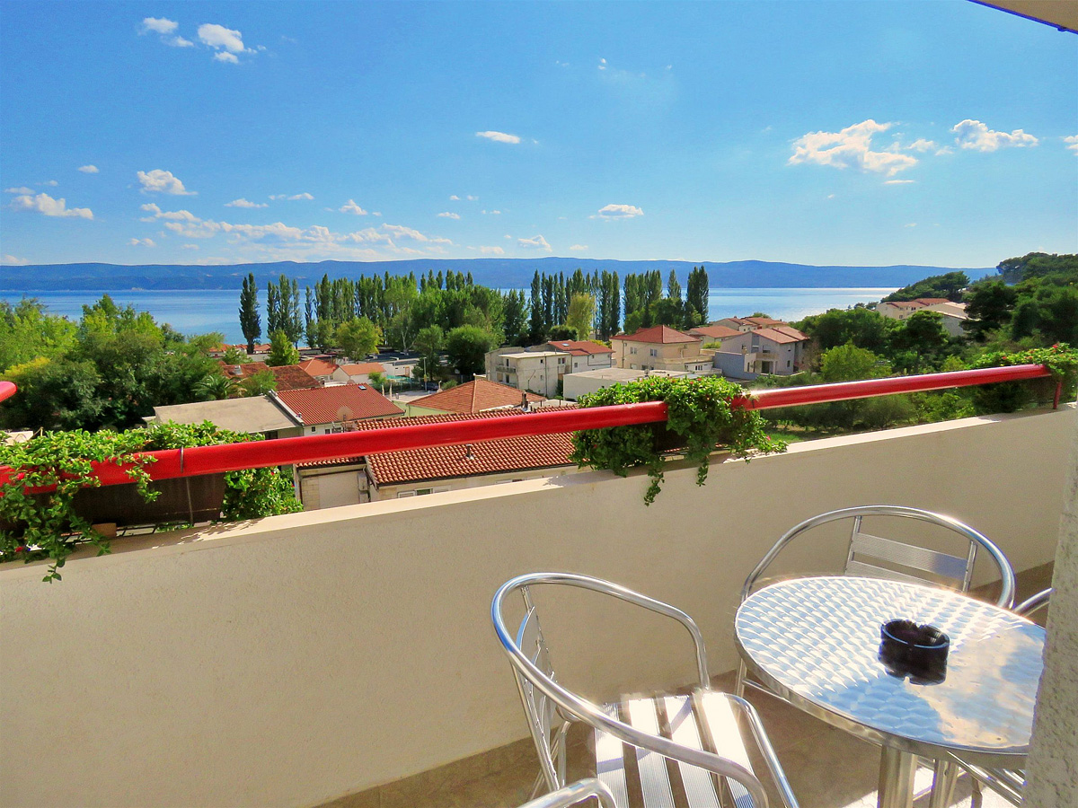 pokoj s manželskou postelí, obývací pokoj s kuchyňským koutem a rozkládacím gaučem pro 2 děti do nedovršených 15 let, sociální zařízení se sprchou, 2x balkon, jeden s výhledem na moře