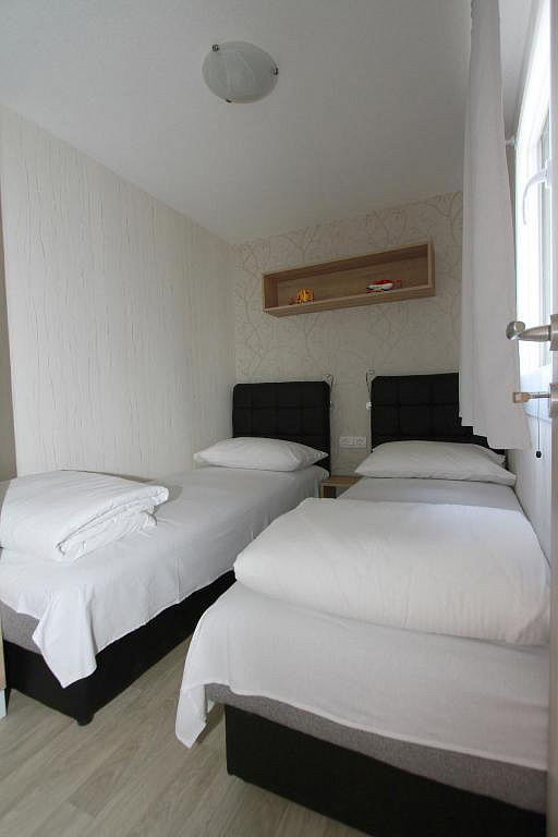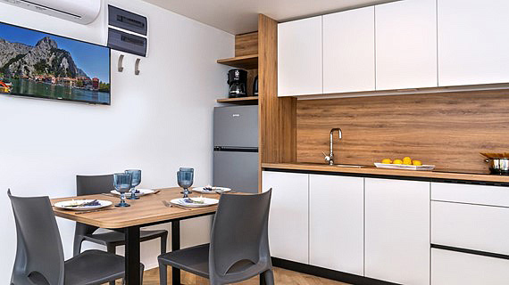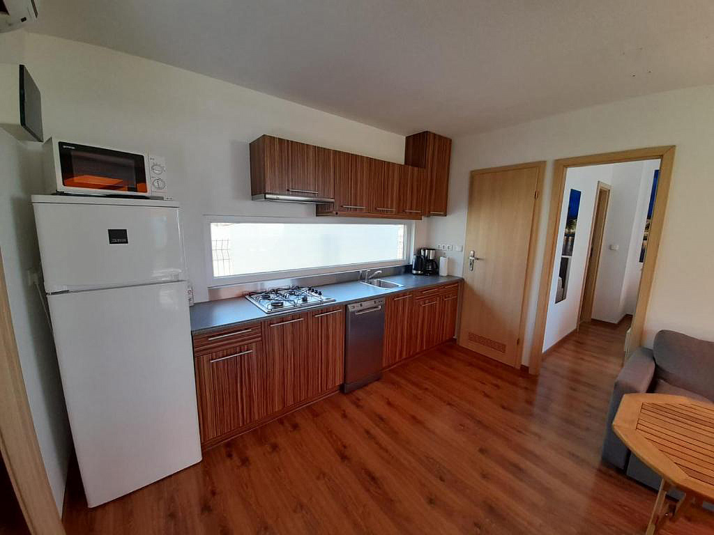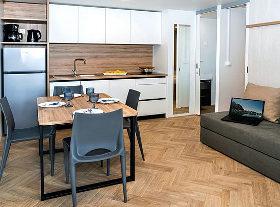 24 m² – ložnice s manželskou postelí, pokoj se dvěma oddělenými lůžky, obývací pokoj s kuchyňským koutem (varná deska, lednice, nádobí, kávovar) a pohovkou pro 2 děti do nedovršených 12 let, sociální zařízení se sprchou, zastřešená terasa
