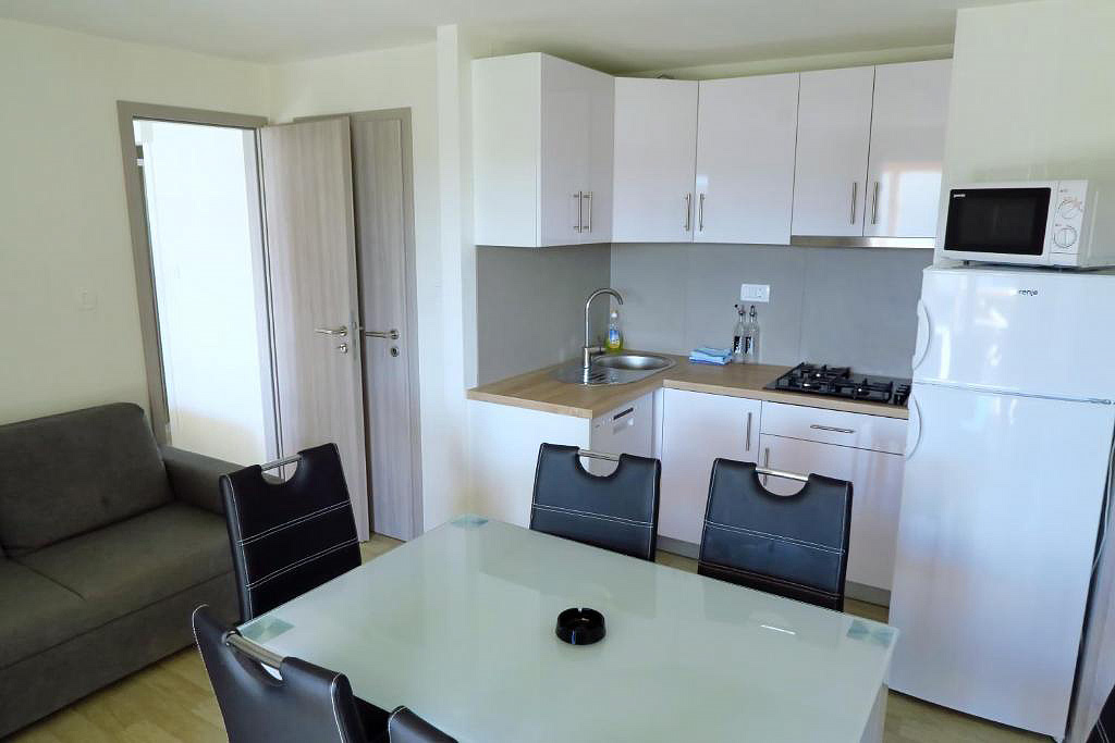 40 m² - 1 ložnice s manželskou postelí, 2 pokoje se dvěma oddělenými lůžky, obývací pokoj s kuchyňským koutem (myčka, sklokeramická varná deska, mikrovlnná trouba, lednice a nádobí) a rozkládací pohovkou pro 2 děti do nedovršených 12 let, sociální zařízení se sprchou, zastřešená terasa