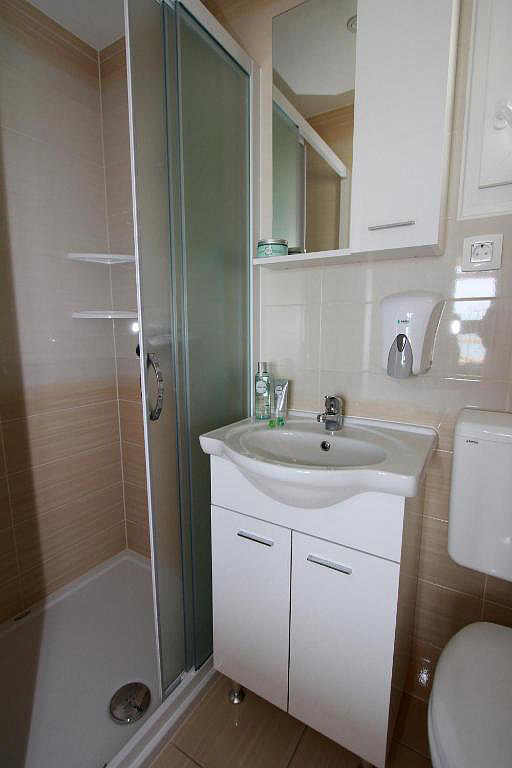 34 m² - ložnice s manželskou postelí, pokoj s dvěma oddělenými lůžky, obývací pokoj s kuchyňským koutem (varná deska, lednice, kávovar) a pohovkou pro dítě do nedovršených 12 let, 2x sociální zařízení se sprchou, zastřešená terasa s posezením, umístění v poslední řadě nejdále od moře