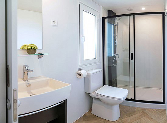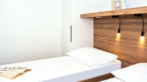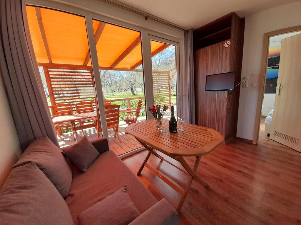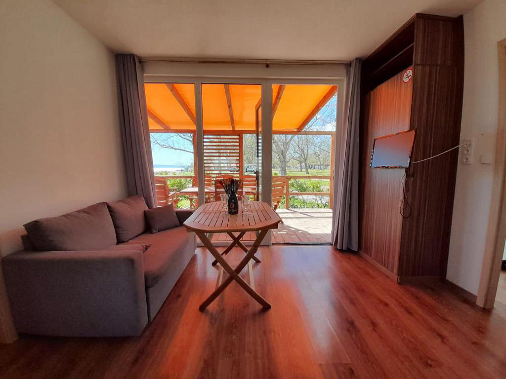 34 m² – ložnice s manželskou postelí, pokoj s dvěma oddělenými lůžky, obývací pokoj s kuchyňským koutem (varná deska, lednice, kávovar) a pohovkou pro dítě do nedovršených 12 let, 2x sociální zařízení se sprchou, zastřešená terasa s posezením