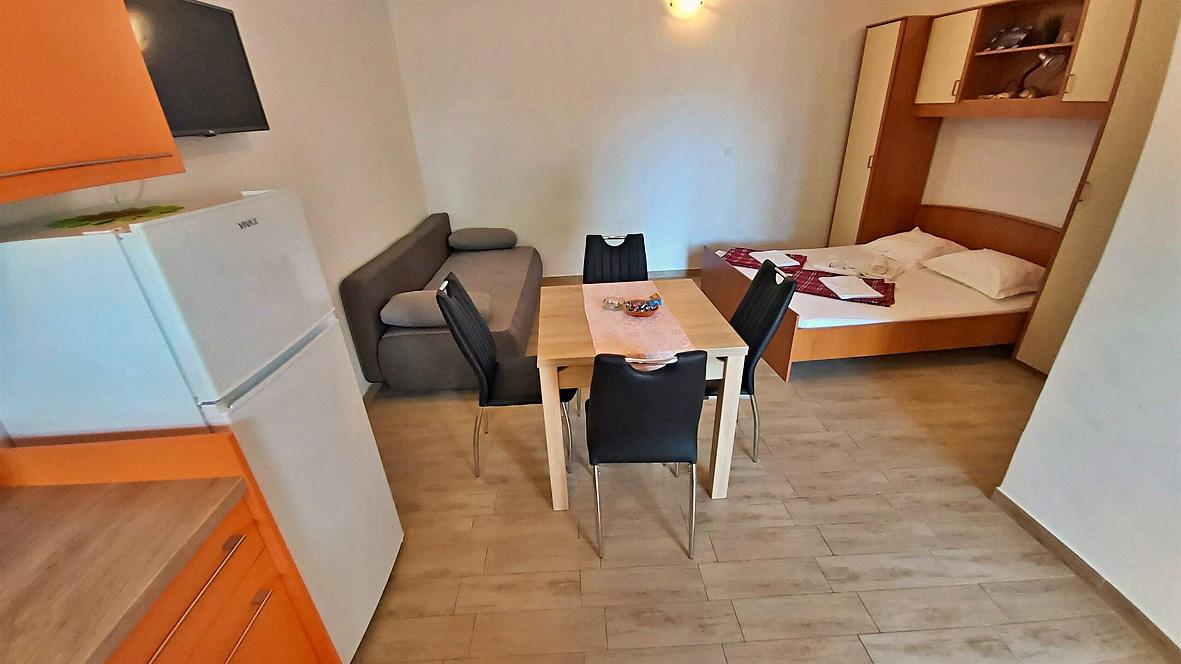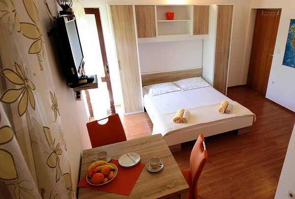 obývací pokoj s kuchyňským koutem a manželskou postelí, sociální zařízení, balkon s výhledem na moře