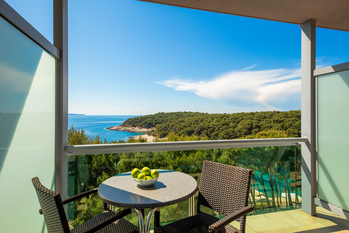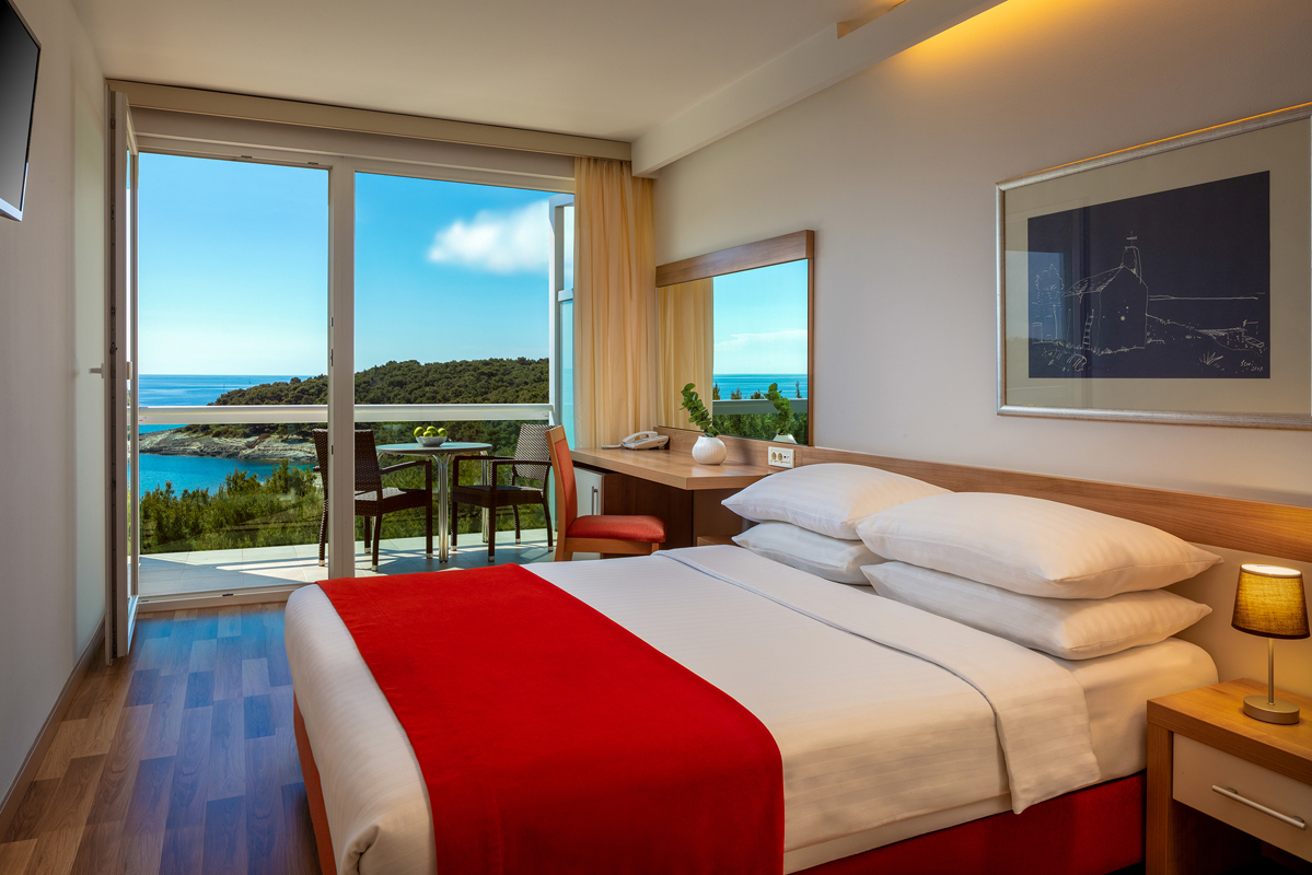 22 m², pokoj s manželskou postelí nebo dvěma oddělenými lůžky s možností přistýlky formou rozkládacího gauče (75x180 cm) pro dítě do nedovršených 5 let, sociální zařízení se sprchou, balkon orientovaný na moře