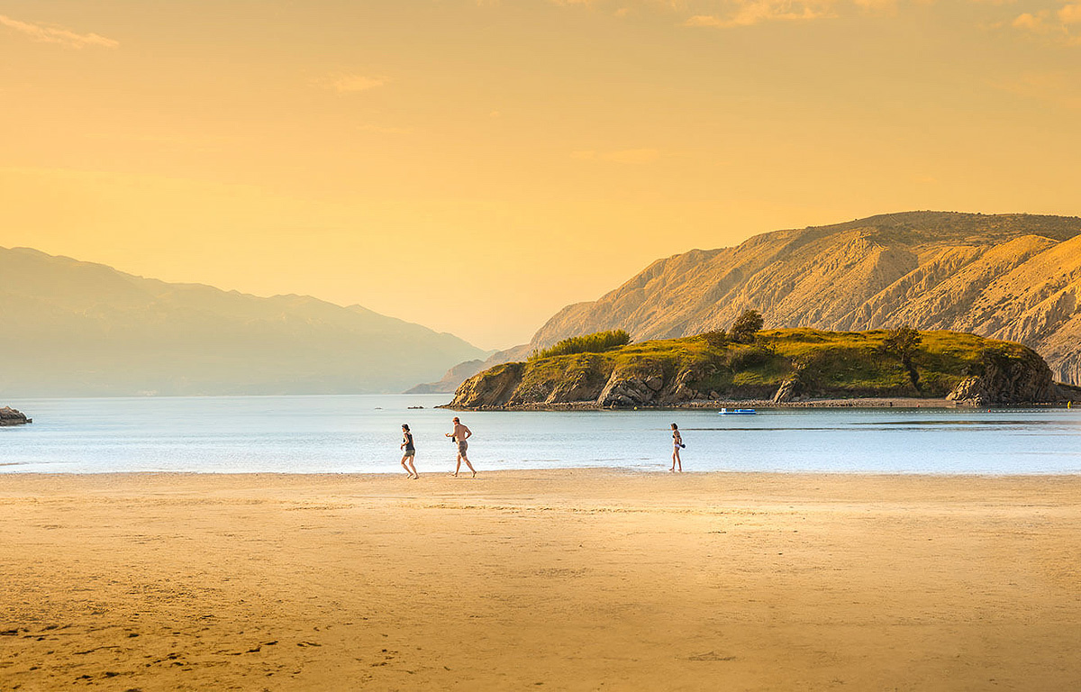 Lopar, ostrov Rab / Kvarner, široká písečná pláž (Rajska plaža) s mělkým mořem (pozvolný vstup) vhodná především pro děti - 100 m, obchod - 300 m, nákupy a bary - 150 m