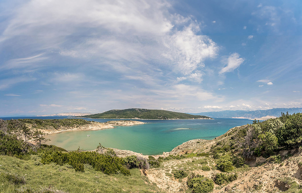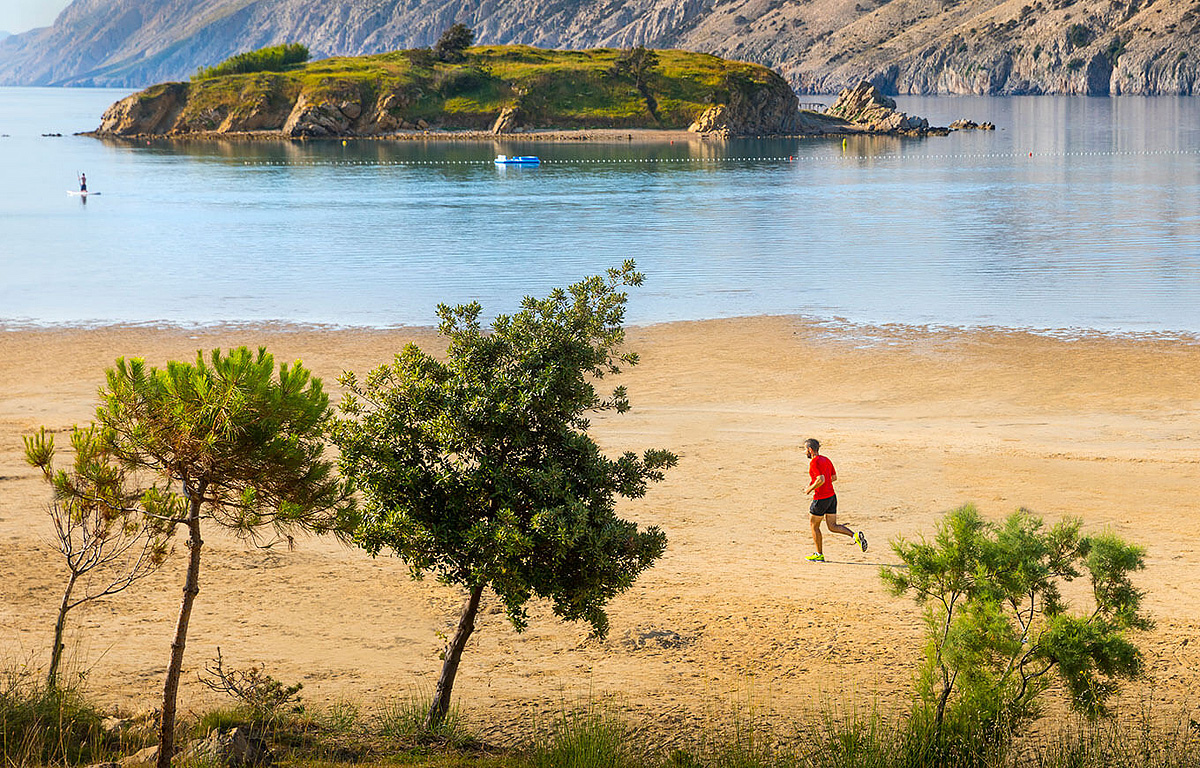 Lopar, ostrov Rab / Kvarner, široká písečná pláž (Rajska plaža) s mělkým mořem (pozvolný vstup) vhodná především pro děti - 150 m, obchod - 300 m, nákupy a bary - 150 m