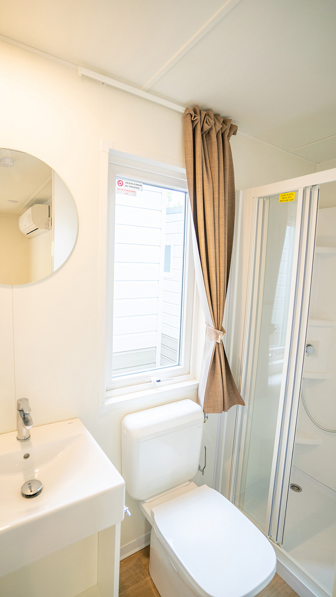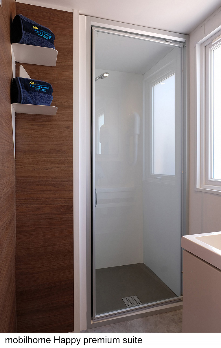ložnice s manželskou postelí, 2 ložnice se 2 samostatnými lůžky, obývací pokoj s rozkládací lavicí, která představuje přistýlku, sociální zařízení se sprchou, v některých mobilehome je oddělená toaleta, krytá terasa se zahradním nábytkem, k dispozici je reproduktor na Bluetooth
