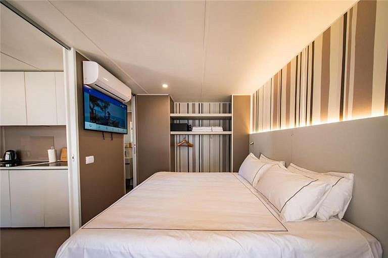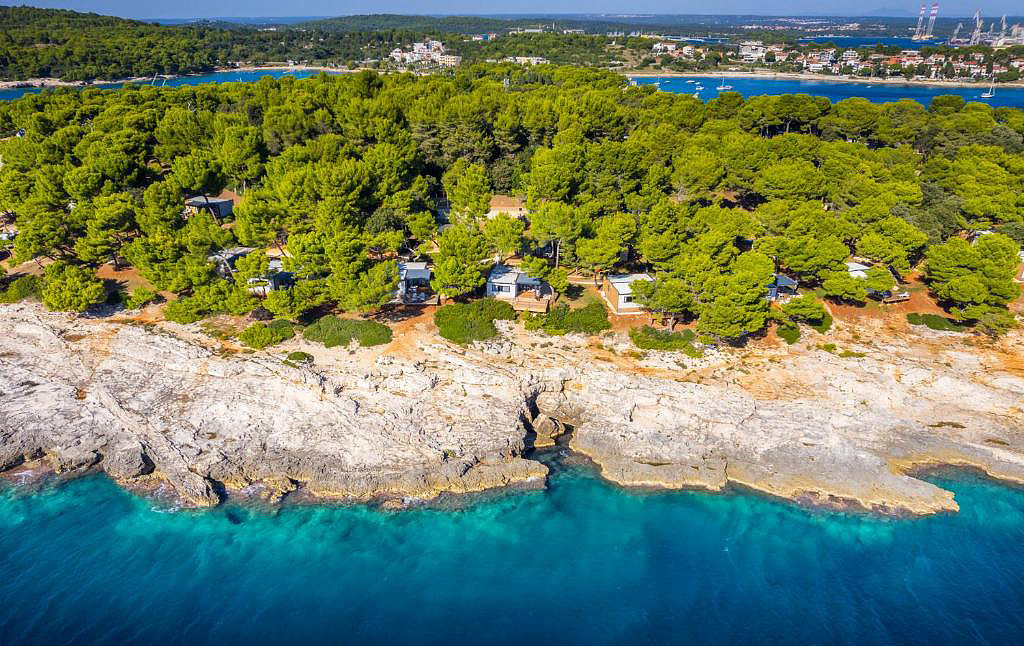 moderní mobilní domky ležící na klidném poloostrově v kempu Stoja na okraji města Pula