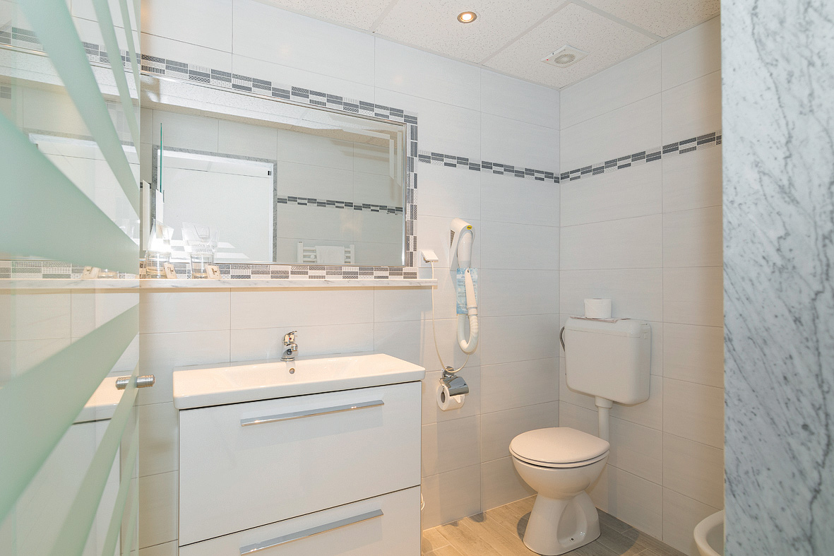 pokoj pro 4 osoby s manželskou postelí nebo dvěma oddělenými lůžky, rozkládací pohovka pro 2 děti do nedovršených 18 let nebo jednu dospělou osobu, sociální zařízení se sprchou, balkon orientovaný na moře