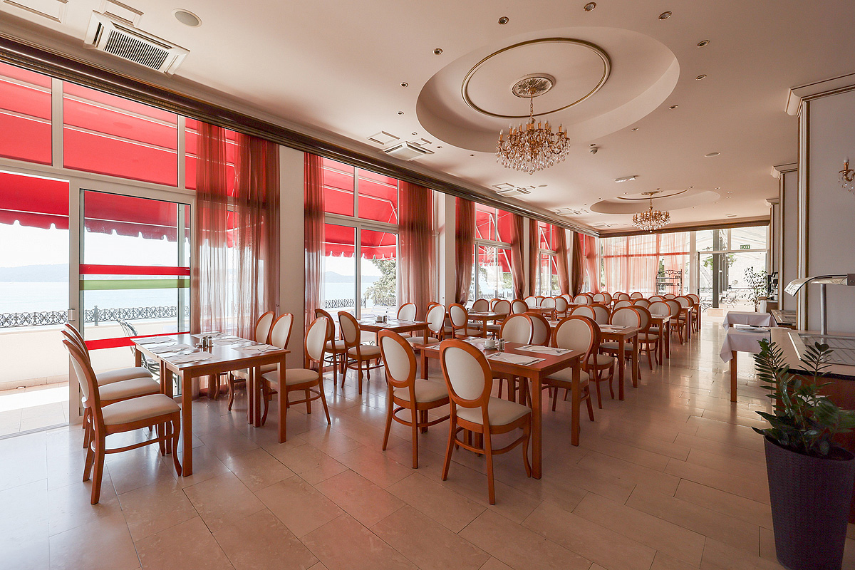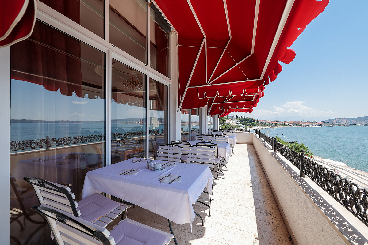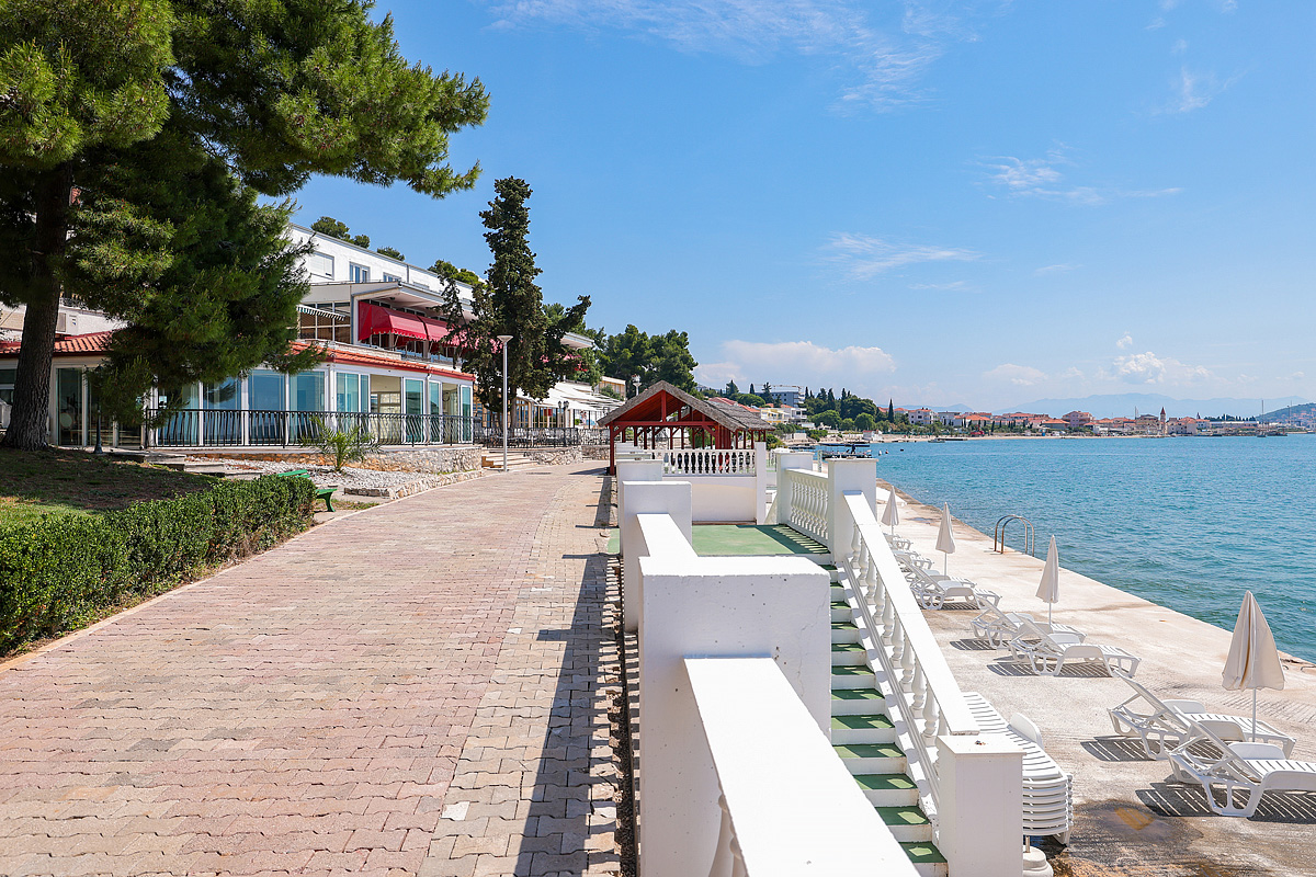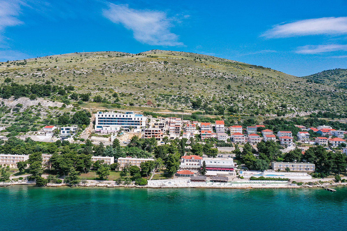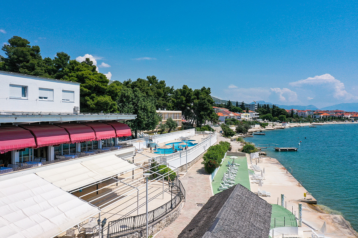 hotel se skládá z hlavní budovy a pavilonů s pokoji, které se táhnou podél mořského pobřeží, z jejichž balkonů a teras je výhled mezi borovicemi na Trogirský záliv a dalmatské ostrovy;