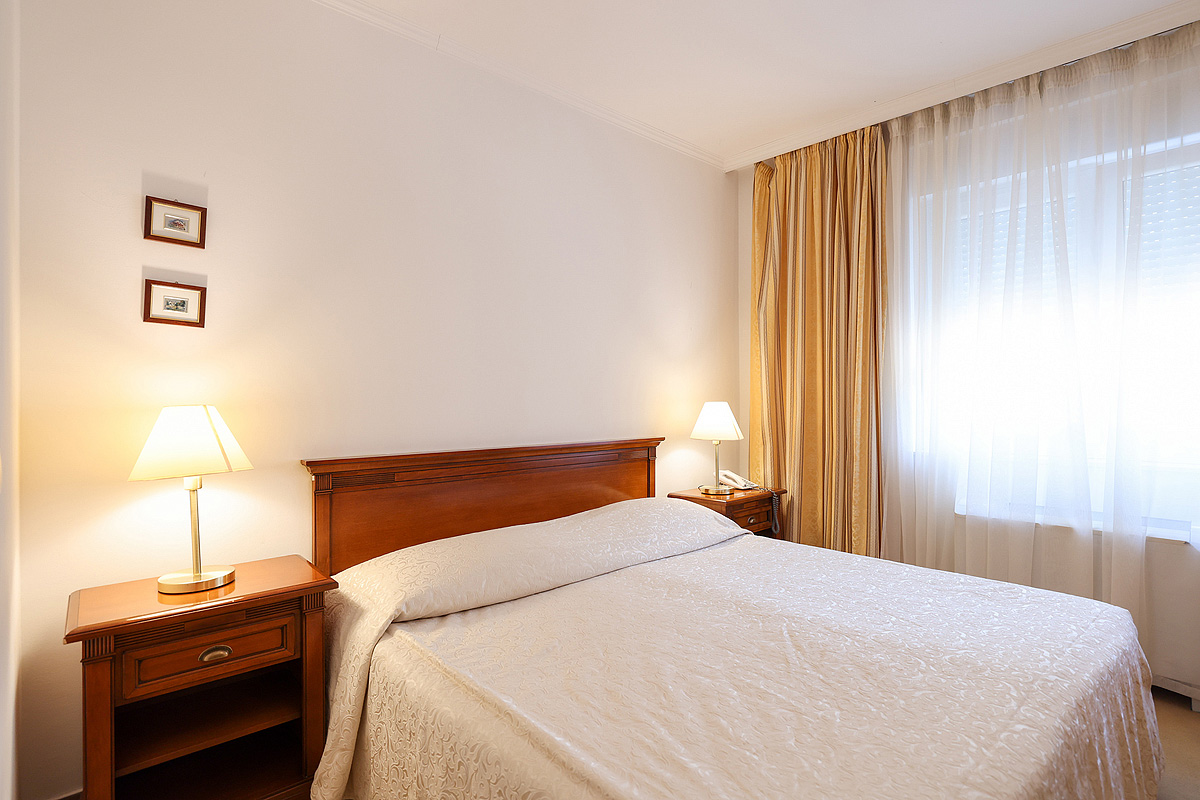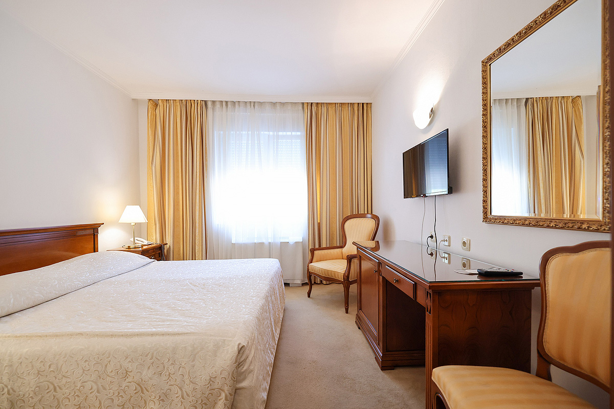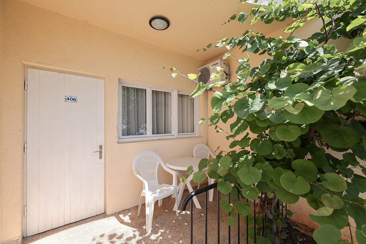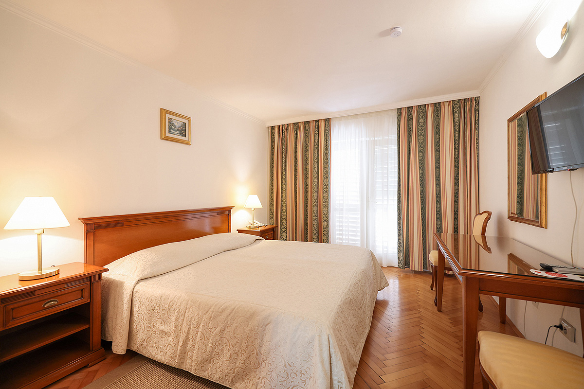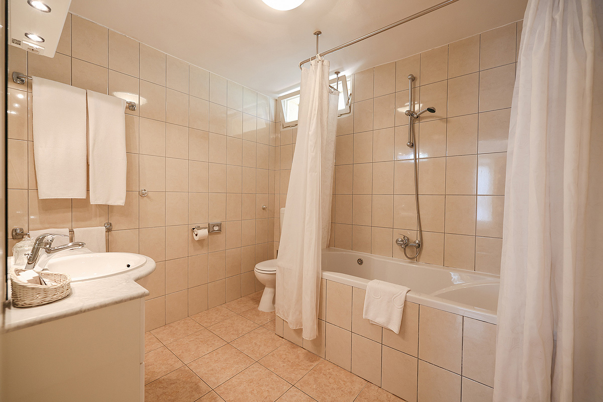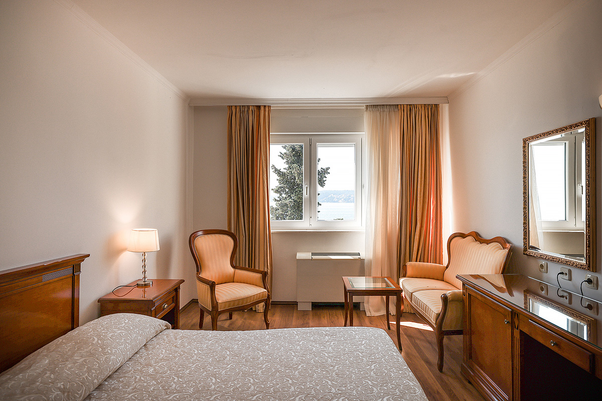 19 m² - pokoj s manželskou postelí či 2 samostatnými lůžky s možností přistýlky formou rozkládacího lůžka, sociální zařízení, pokoj orientován na mořskou stranu; hlavní budova
