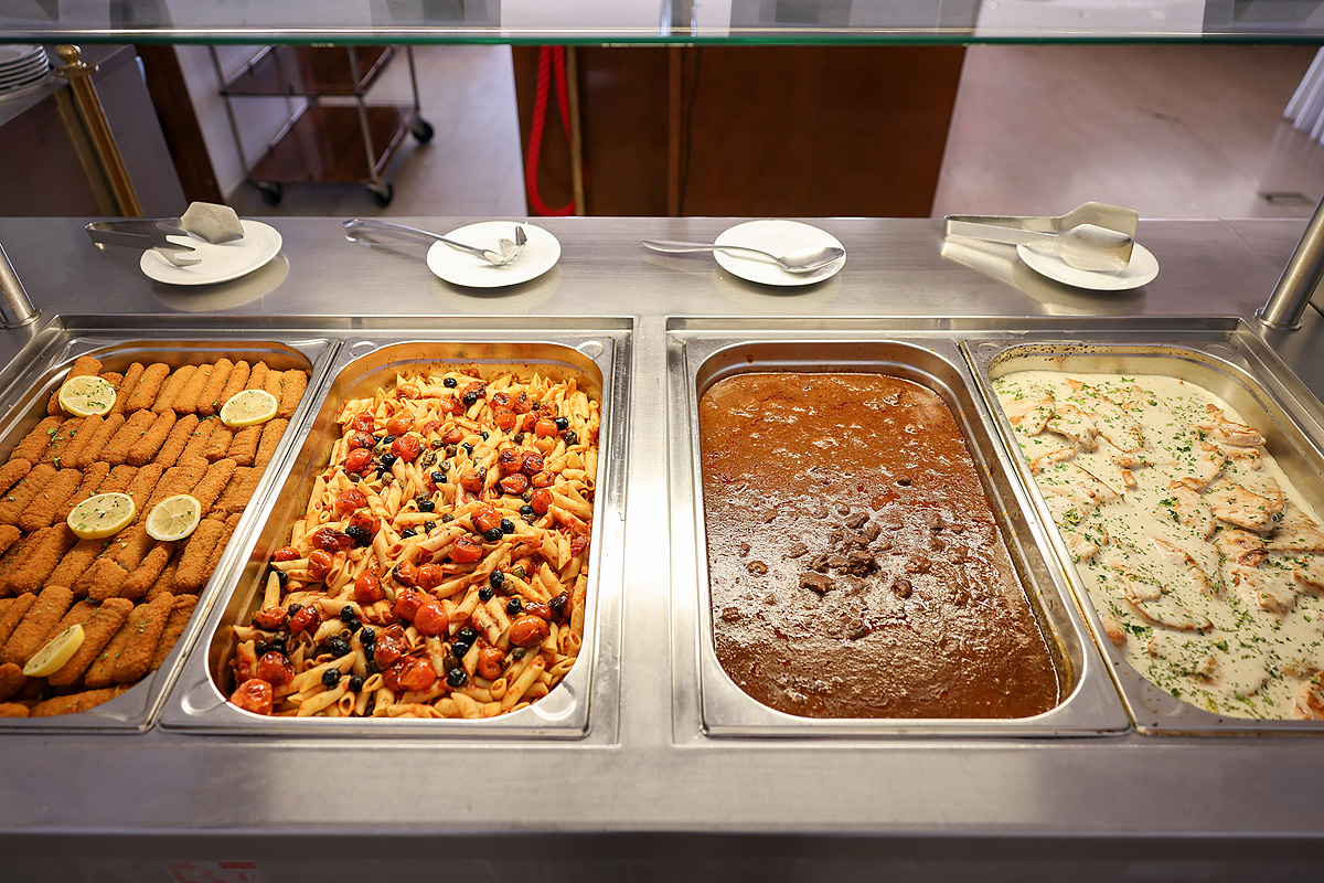 formou bufetu (12:30 - 14:00), výběr ze 3 hlavních jídel, přílohy, jeden druh polévky, předkrmy, dezerty dle denní nabídky