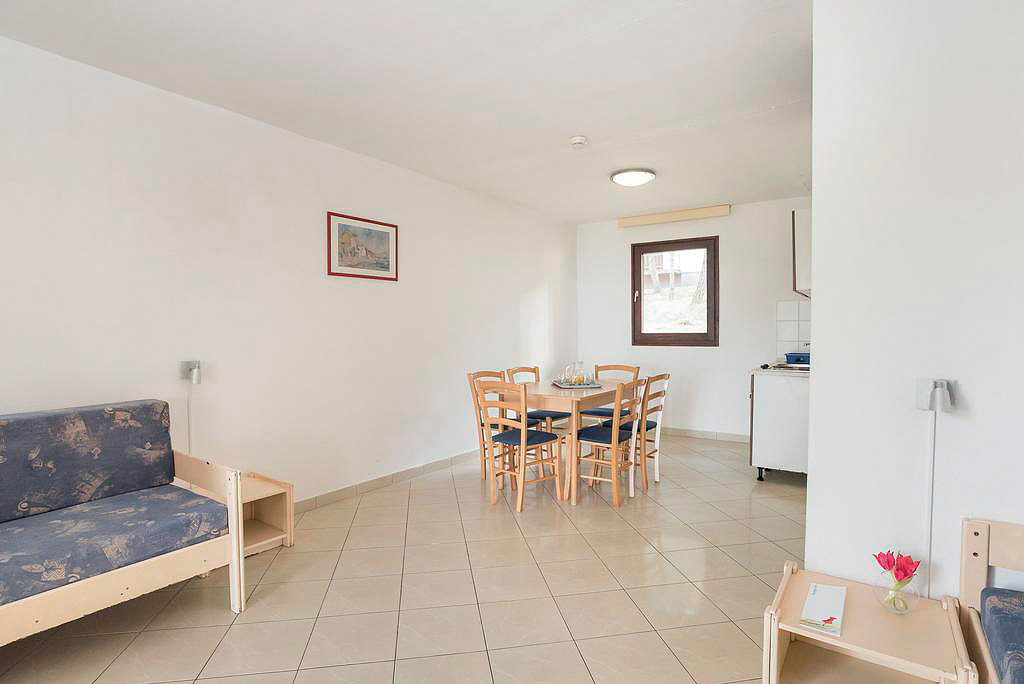 46 m² - 1 ložnice se 2 samostatnými lůžky, 1 ložnice s 1 či 2 samostatnými lůžky, obývací pokoj s 1 lůžkem, pohovkou či rozkládacím gaučem pro 2 osoby a kuchyňským koutem, sociální zařízení, balkon či terasa