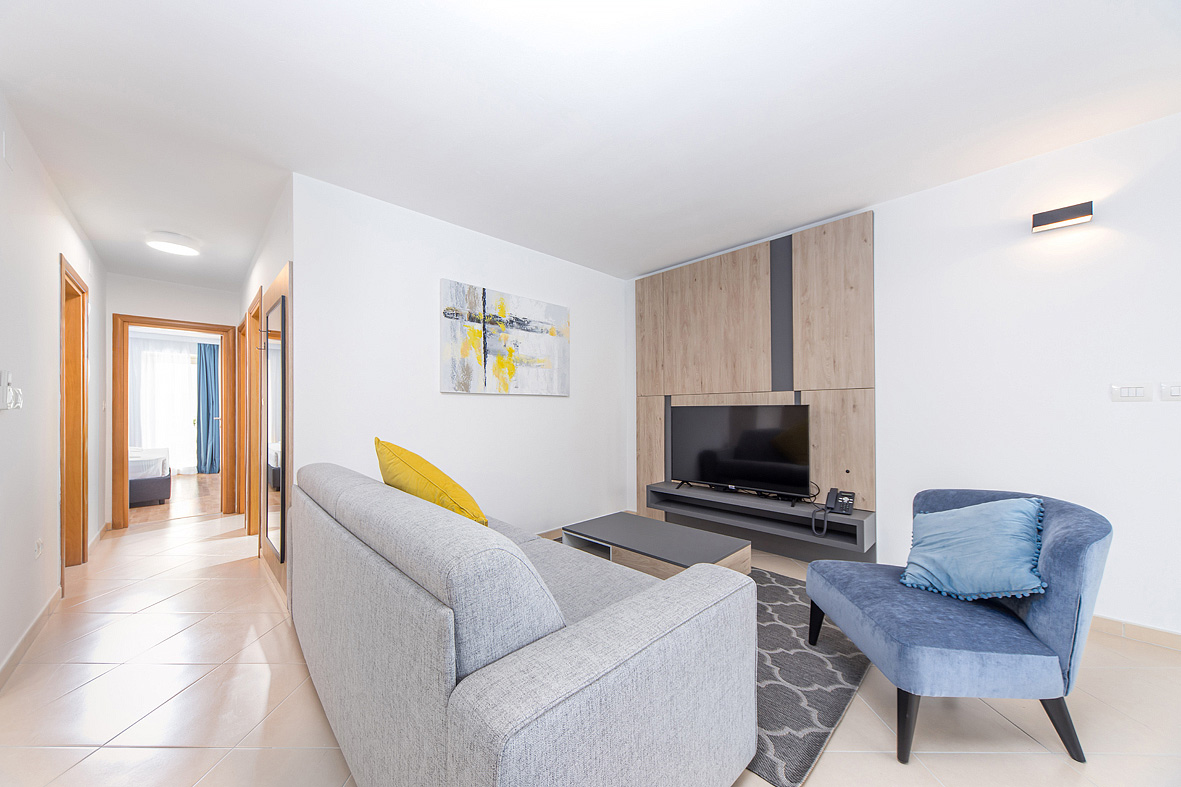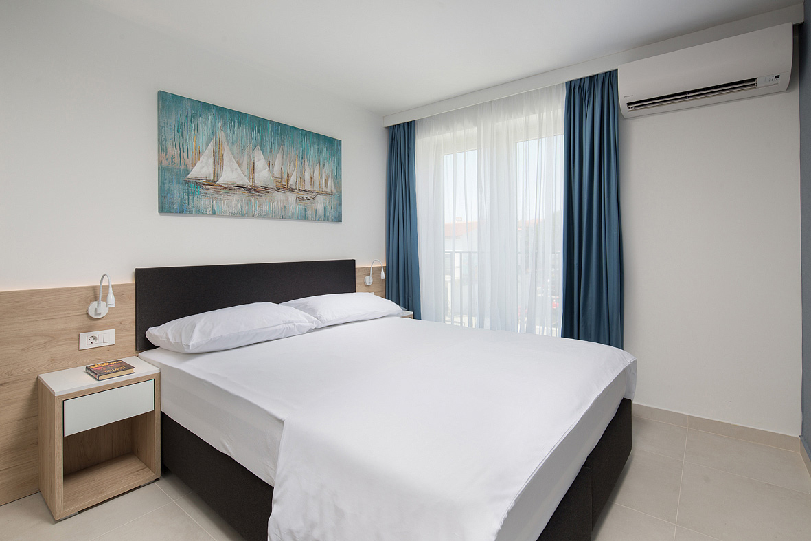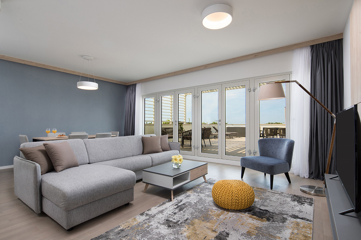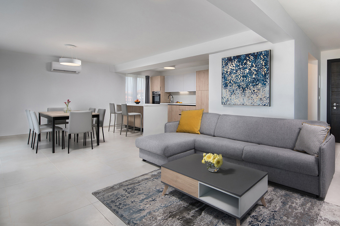 77 m² - 1 pokoj s manželskou postelí, 1 pokoj se 2 jednolůžkovými postelemi, obývací pokoj s rozkládacím gaučem pro 2 osoby a vybaveným kuchyňským koutem, balkon nebo terasa orientované k moři, sociální zařízení