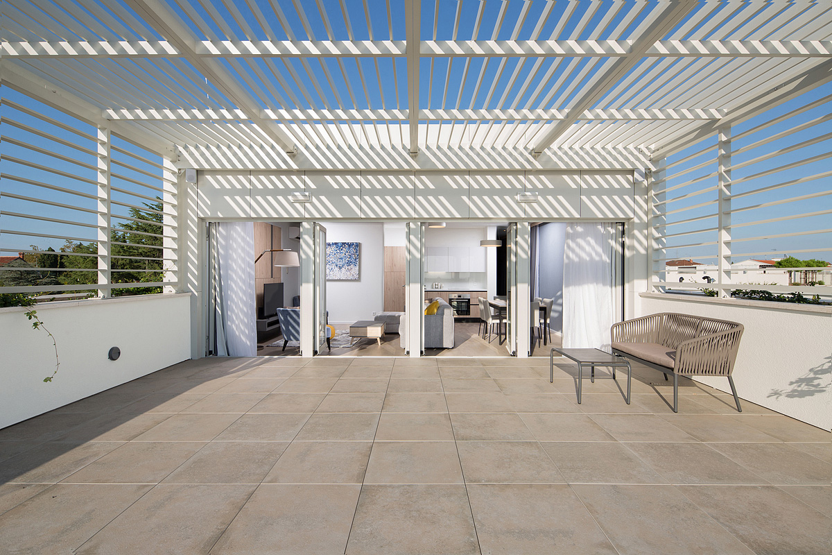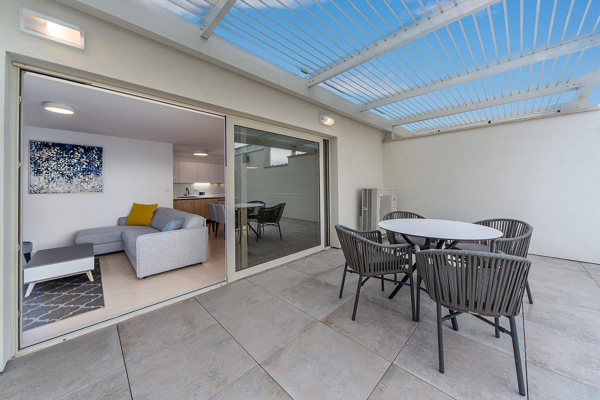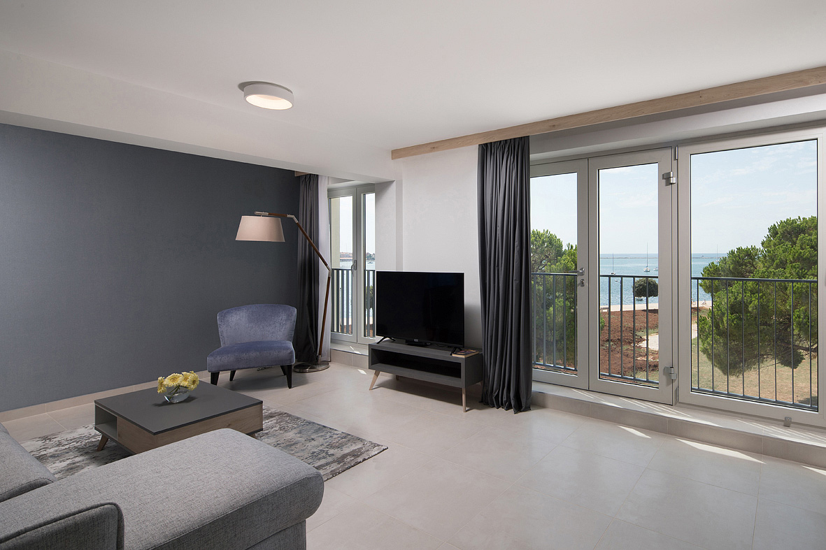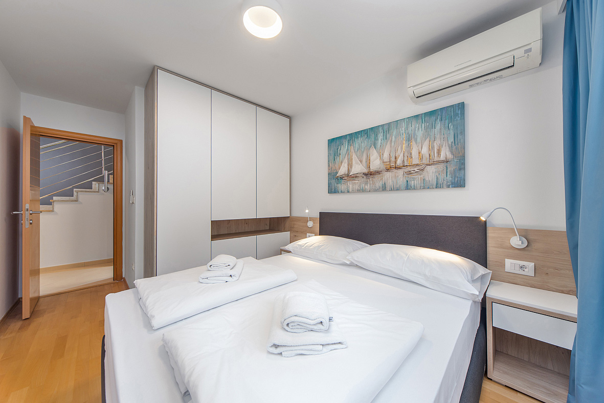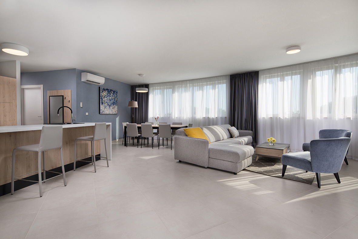 77 m² - 1 pokoj s manželskou postelí, 1 pokoj se 2 jednolůžkovými postelemi, obývací pokoj s rozkládacím gaučem pro 2 osoby a vybaveným kuchyňským koutem, balkon nebo terasa orientované k moři, sociální zařízení