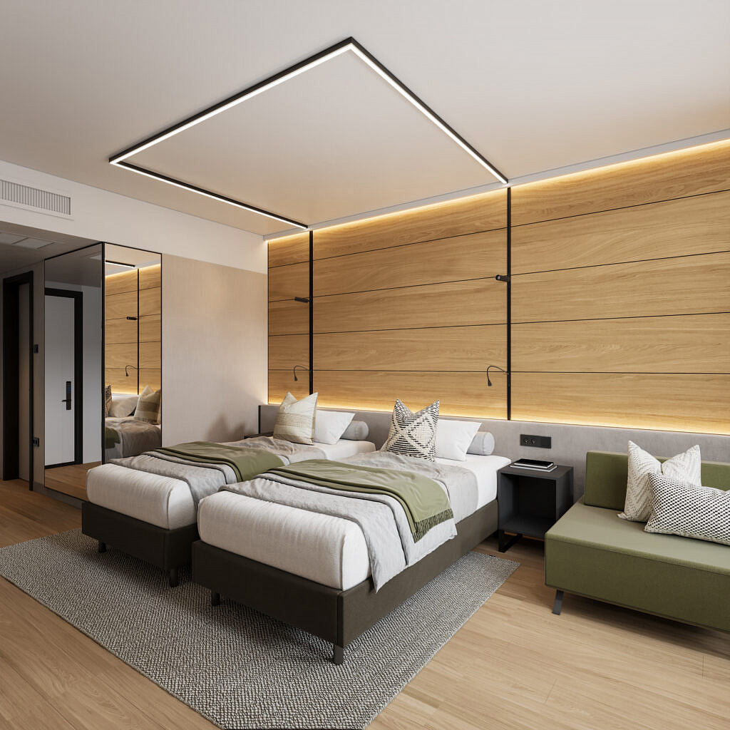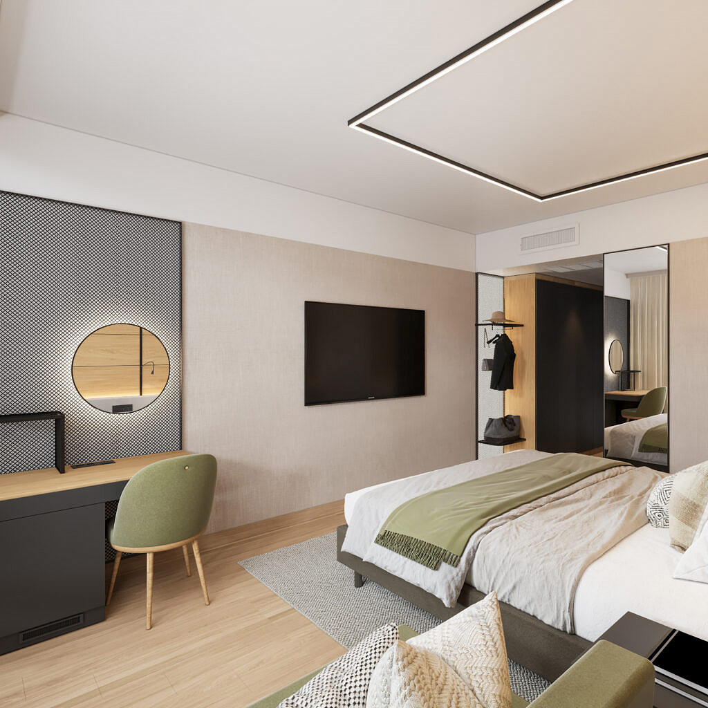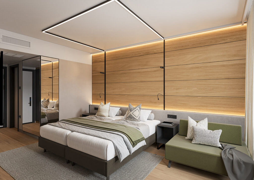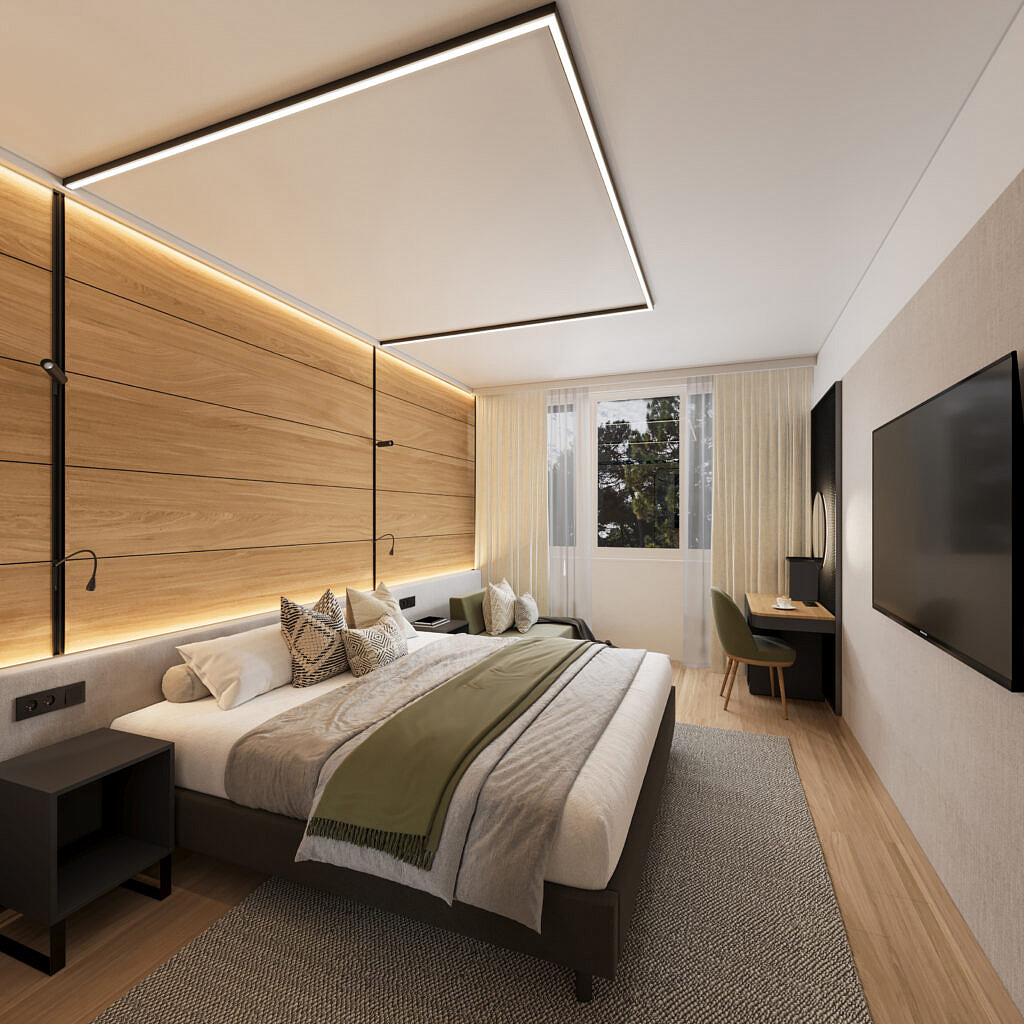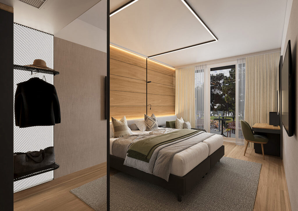 21 m² - pokoj s manželskou postelí či 2 samostatnými lůžky s možností přistýlky pro jednu osobu, sociální zařízení, balkon orientovaný na park