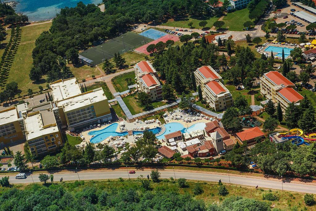 venkovní bazén s vodopády a vodními atrakcemi, úschovna kol, skluzavky (miniaquapark na rozloze 1100 m²), dětský bazén, wellness centrum - vnitřní bazén, whirlpool*, sauna* (turecká, 2x finská, solná), masáže*, fitness, tenisové kurty*, stolní tenis*, minigolf*, plážový volejbal*, hřiště pro míčové hry*, animace, vodní sporty*, jezdecké centrum*, půjčovna* a úschovna jízdních kol, turistický vláček (každých 30 min.) do města Umag;
