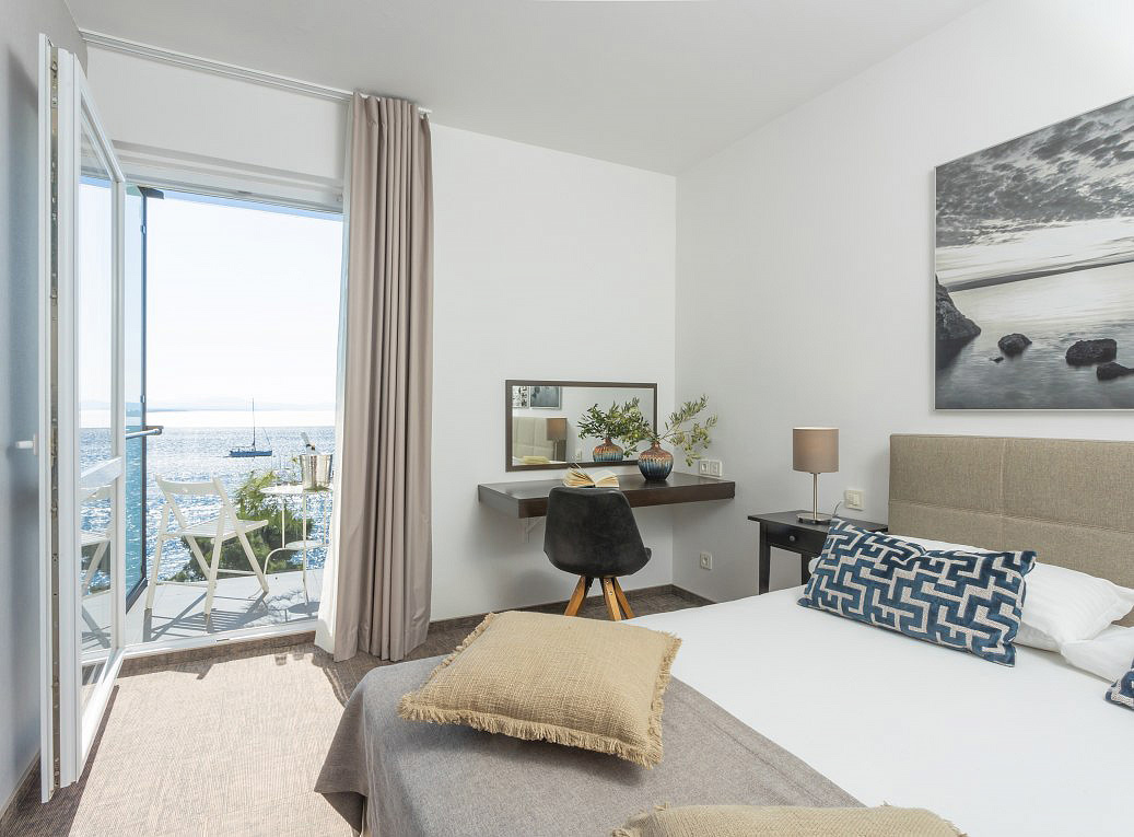 pokoj s manželskou postelí, sociální zařízení se sprchou, balkon s pohledem na moře (sea view)