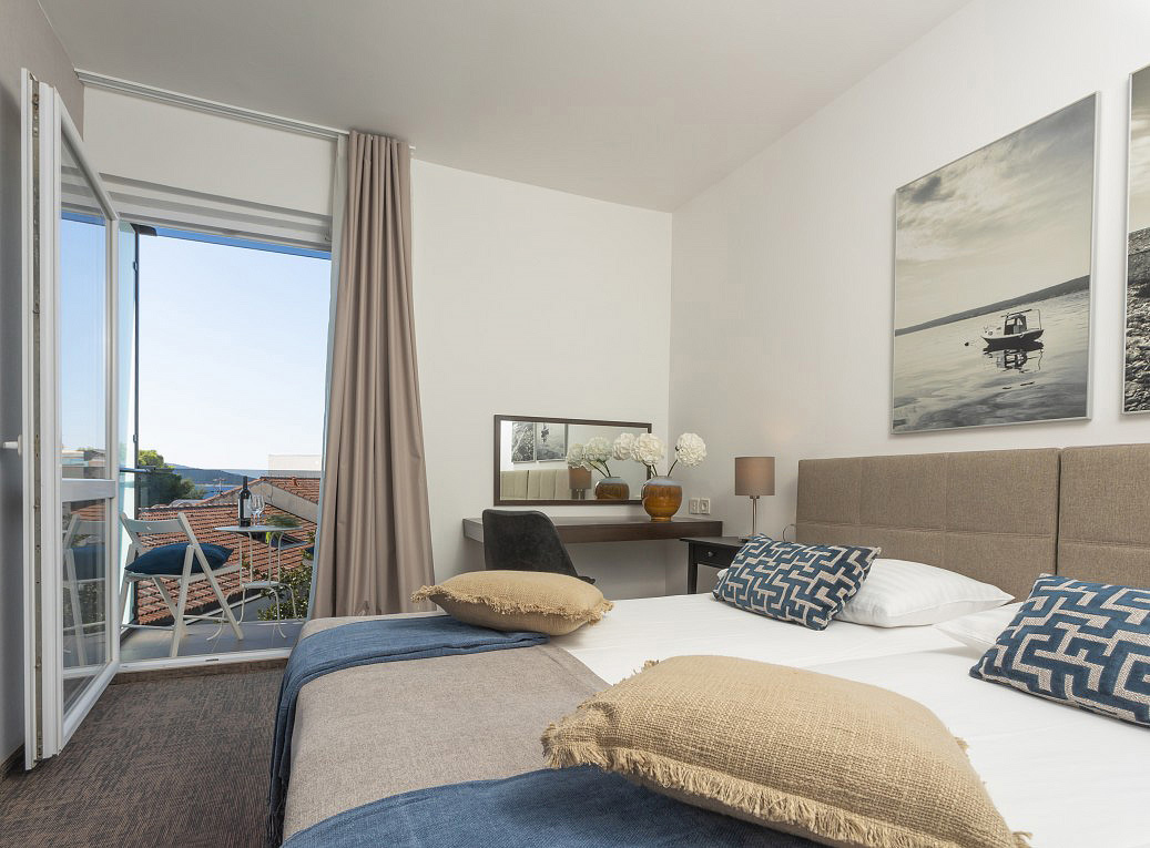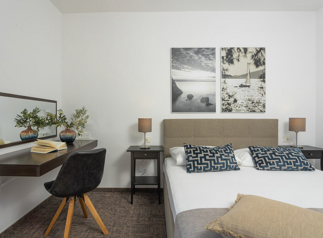 pokoj s manželskou postelí s možností přistýlky formou rozkládacího křesla, sociální zařízení se sprchou, balkon orientovaný k moři (sea side)