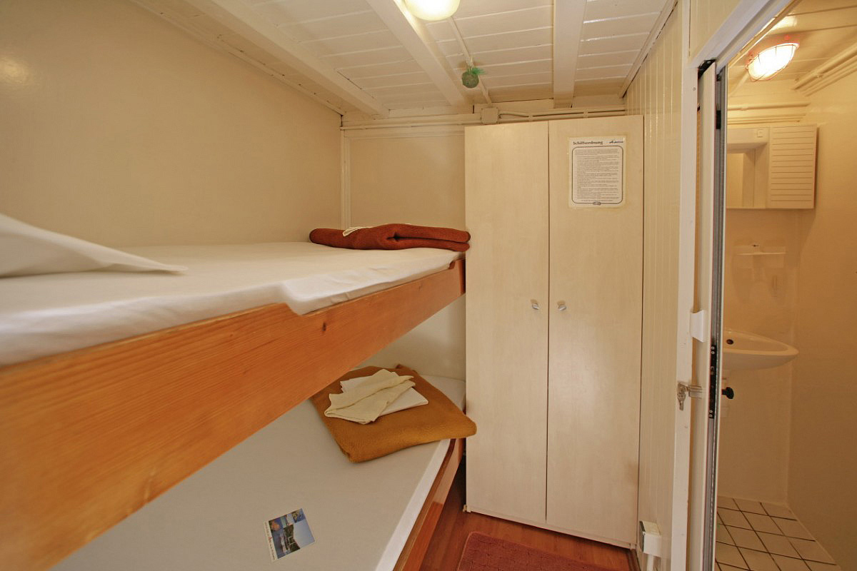 kajuta s francouzským lůžkem a závěsným lůžkem, vlastní sociální zařízení se sprchou a WC