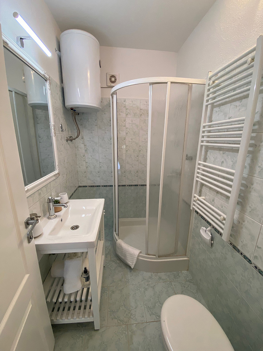 pokoj s manželskou postelí, obývací pokoj s kuchyňským koutem, rozkládacím gaučem pro dítě do nedovršených 18 let a lůžko pro dítě do nedovršených 18 let, sociální zařízení se sprchou, terasa
