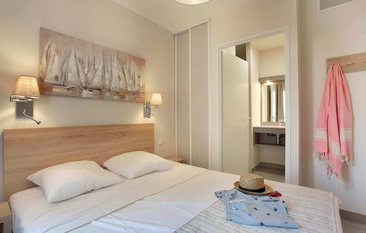 40 m² - 1 ložnice s manželskou postelí, 1 ložnice s 2 oddělitelnými lůžky, obývací pokoj s kuchyňským koutem a rozkládacím gaučem pro 2 osoby (možno i typ "šuplík"), 2 sociální zařízení se sprchou či vanou, terasa či balkon