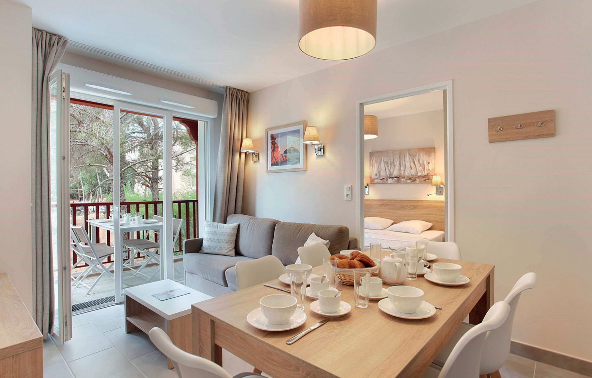 28 m² - 1 ložnice s manželskou postelí či s oddělitelnými lůžky, obývací pokoj s kuchyňským koutem a rozkládacím gaučem pro 2 osoby (možno i typ "šuplík"), sociální zařízení se sprchou, terasa či balkon