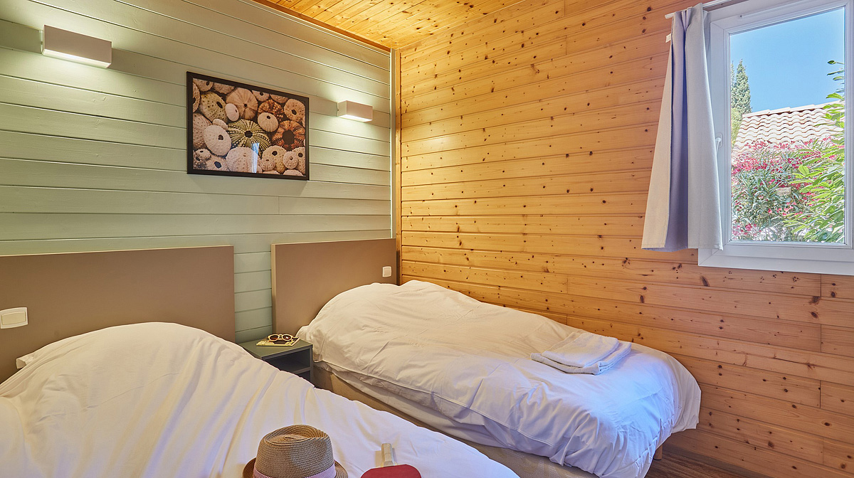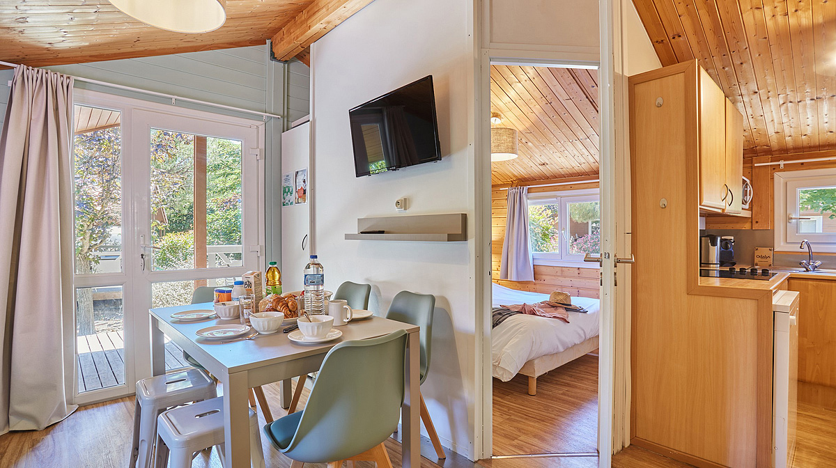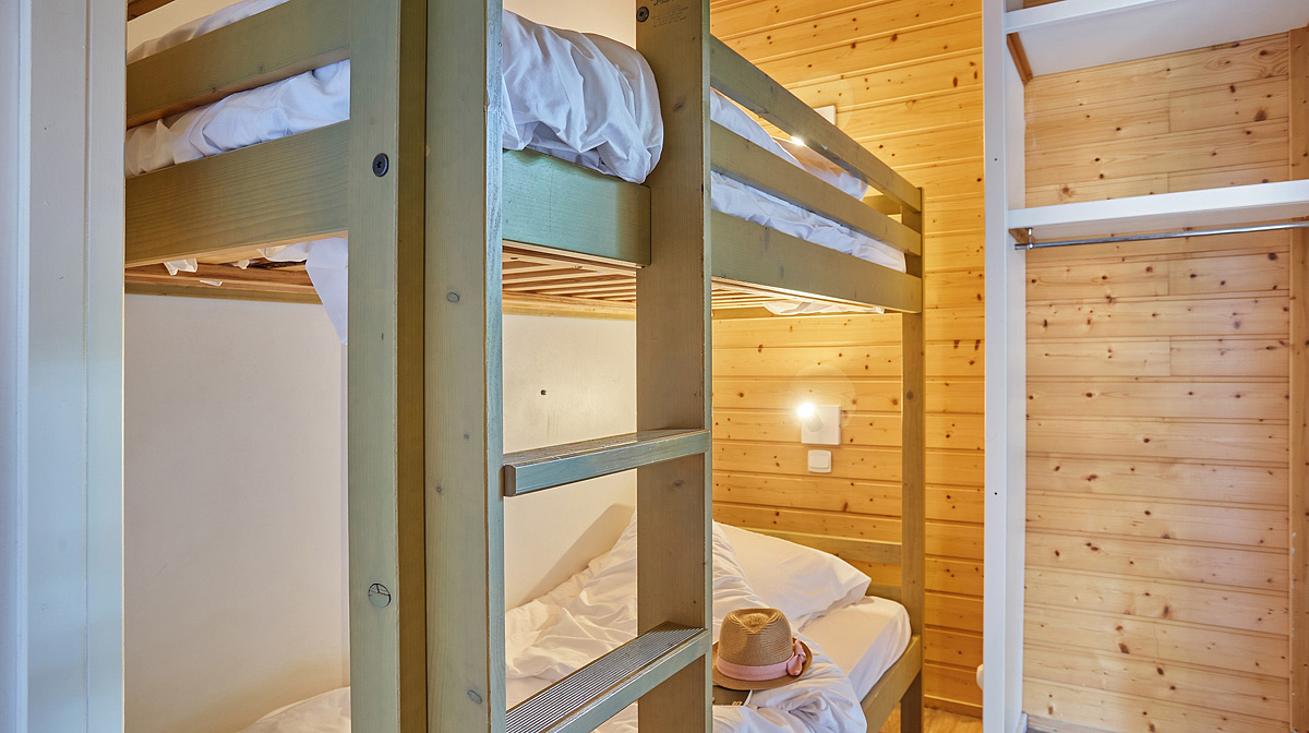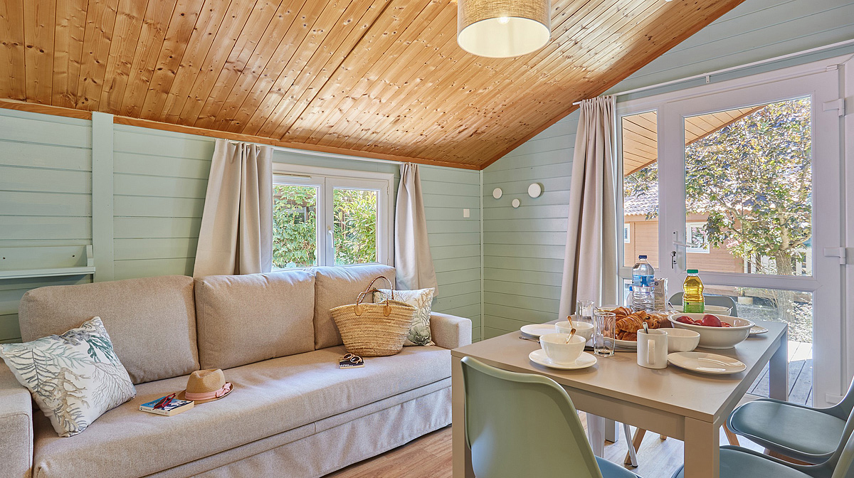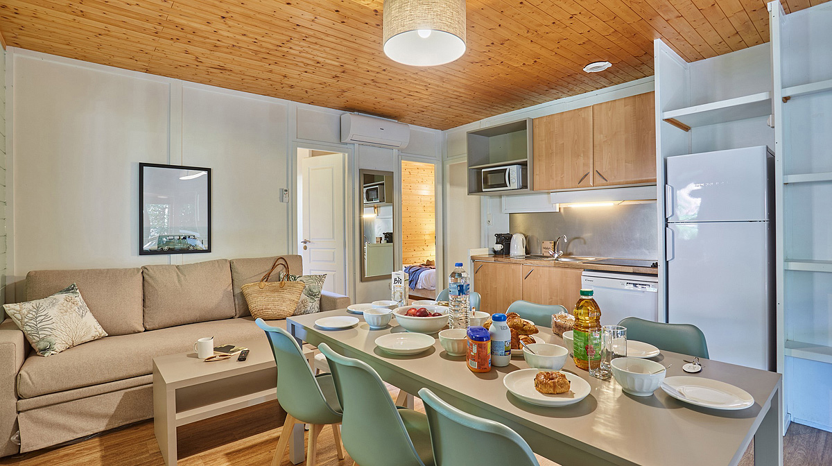 48 m² - ložnice s manželskou postelí, ložnice se dvěma oddělenými lůžky, kabina s palandou, obývací pokoj s kuchyňským koutem a dvěma oddělenými lůžky, sociální zařízení se sprchou, krytá terasa