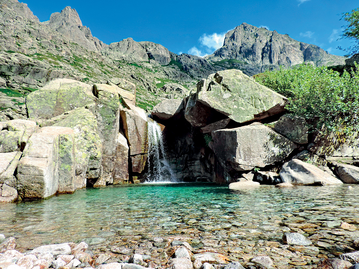 Korsika ale není jen o plážích a moři, vždyť jedním z jejích básnických označení je i „hora v moři“. Vnitrozemím se táhne žulové pohoří dosahující až 2.170 metrů výšky, které bývá v zimních měsících pokryto sněhem. Na jihu nalezneme měkké miocénské křídové útesy a sever nám zase nabídne rozeklaná břidlicová skaliska. Milovníky horské turistiky zde čeká nepřeberné množství tras vedoucích horskými kotlinami, kde je možno zahlédnout plachého muflona či divokého koně, kolem jedinečných jezer poskytujících dostatek vody pro spousty říček a potoků, či snad výstup na nejvyšší korsické velikány s neopakovatelnou vyhlídkou do dalekého okolí a k moři. Pokud jste právě milovníky takovéto aktivní dovolené, pak je nutné se do hor důkladně vybavit, protože i v plné letní sezóně je zde počasí velmi proměnlivé a krásný slunečný den se může během chvíle změnit na neprostupnou mlhu a teplota klesá i o několik stupňů. Ve vyšších polohách se dá i v srpnu narazit na ledová pole. Vysoko v horách jsou umístěny salaše nabízející osvěžení v podobě ovčího či kozího sýra a samozřejmě i korsické víno či pálenku.