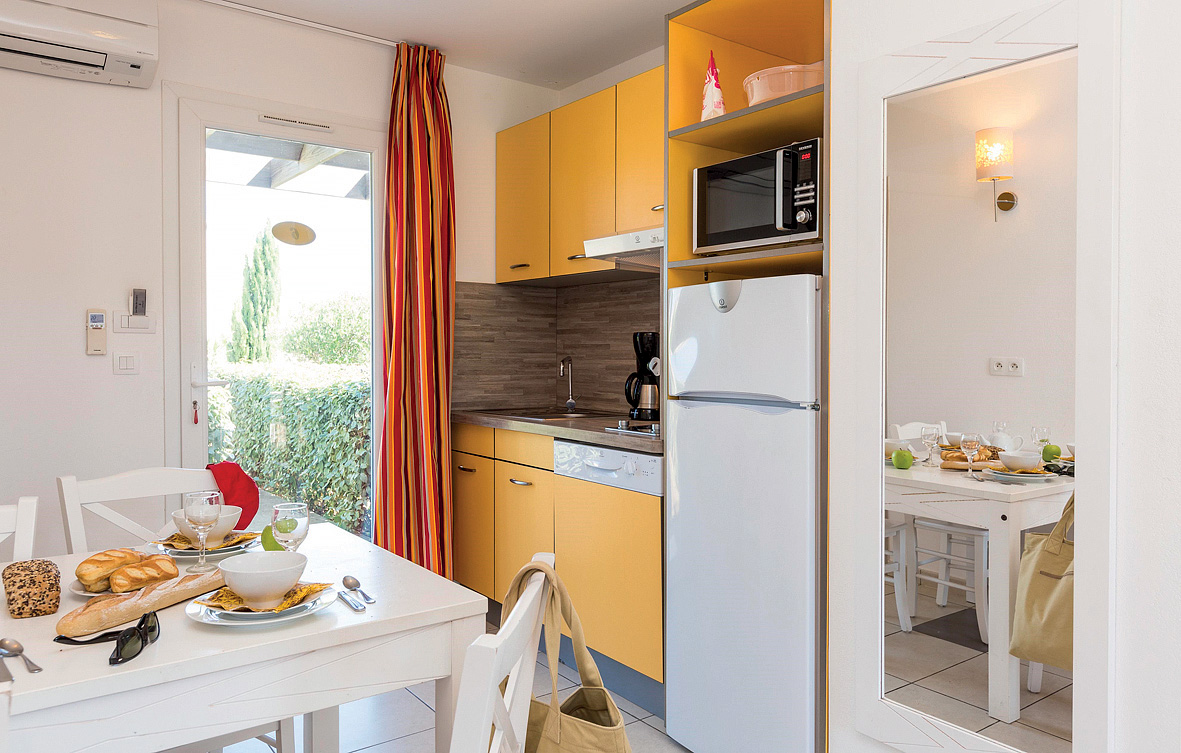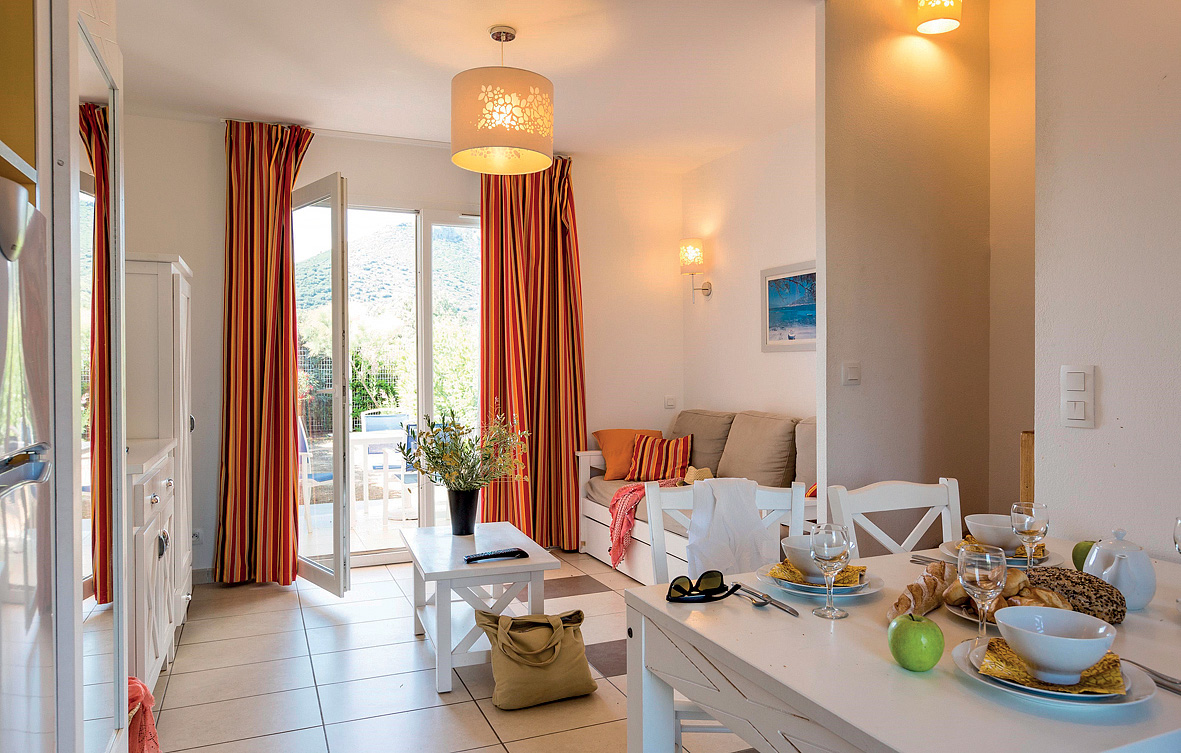 42 m² - 1 ložnice s manželskou postelí, 1 ložnice se 2 samostatnými lůžky, obývací pokoj s kuchyňským koutem a rozkládacím gaučem pro 2 osoby (možno i typ "šuplík"), sociální zařízení s vanou, terasa s posezením