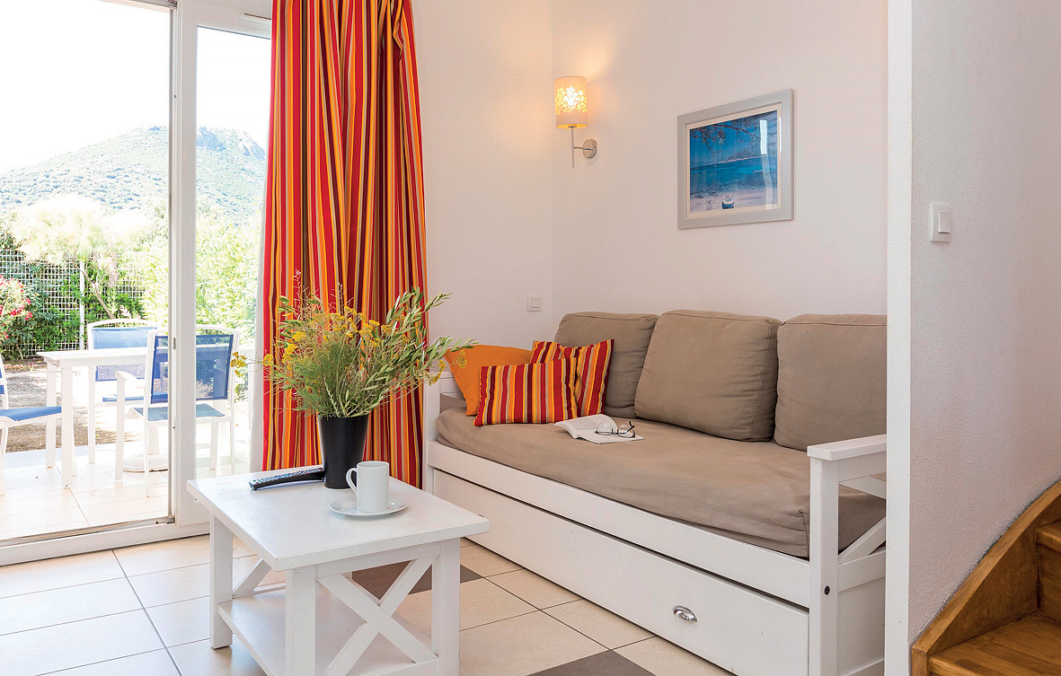 67 m² - 1 ložnice s manželskou postelí, 1 ložnice se 2 samostatnými lůžky, mezipatro s 1 manželskou postelí, obývací pokoj s kuchyňským koutem a rozkládacím gaučem pro 2 osoby (možno i typ "šuplík"), sociální zařízení s vanou, terasa s posezením