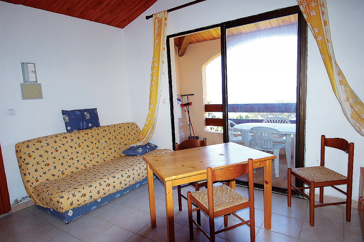 57 m² - 1 ložnice s manželskou postelí, 1 ložnice s manželskou postelí či palandou, obývací pokoj s částečně odděleným kuchyňským koutem a rozkládacím gaučem pro 2 osoby o velikosti 1,5 běžného lůžka, sociální zařízení se sprchou, balkon
