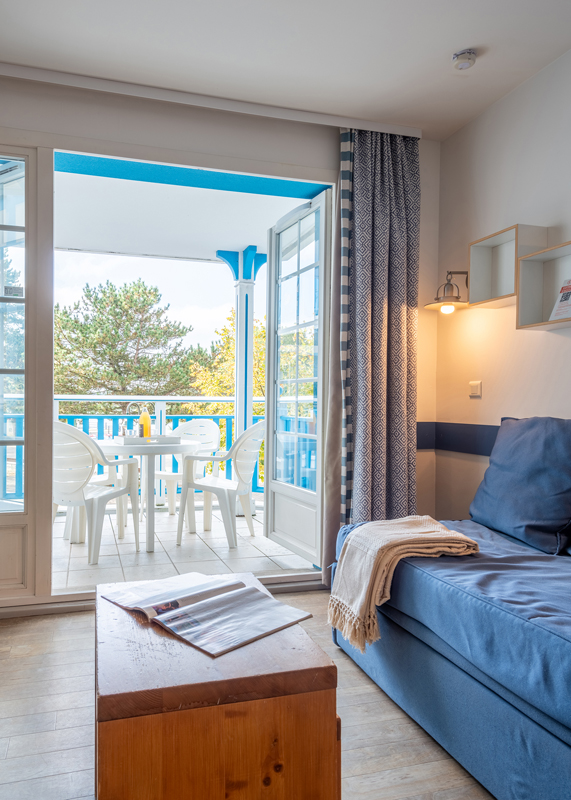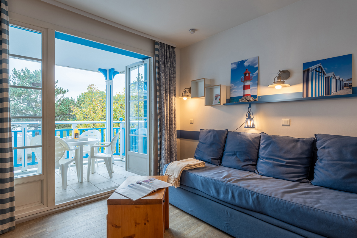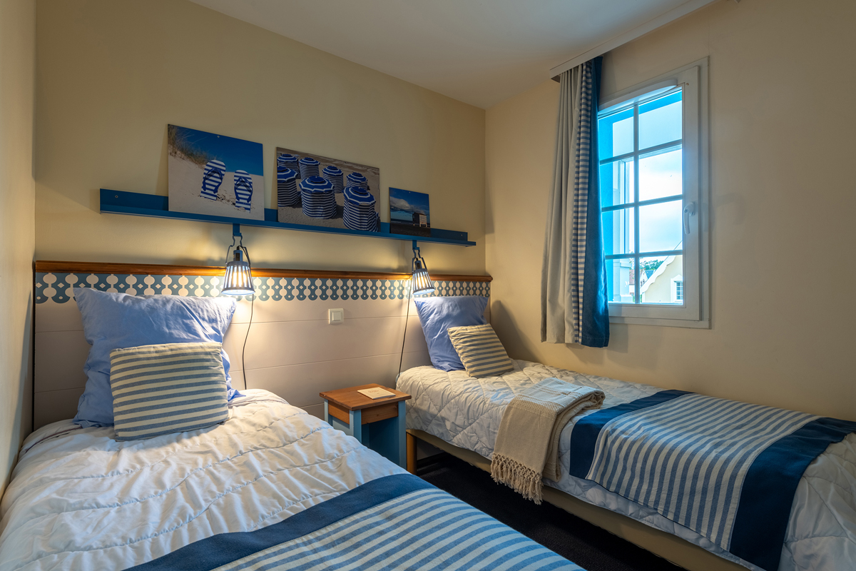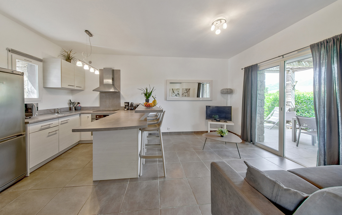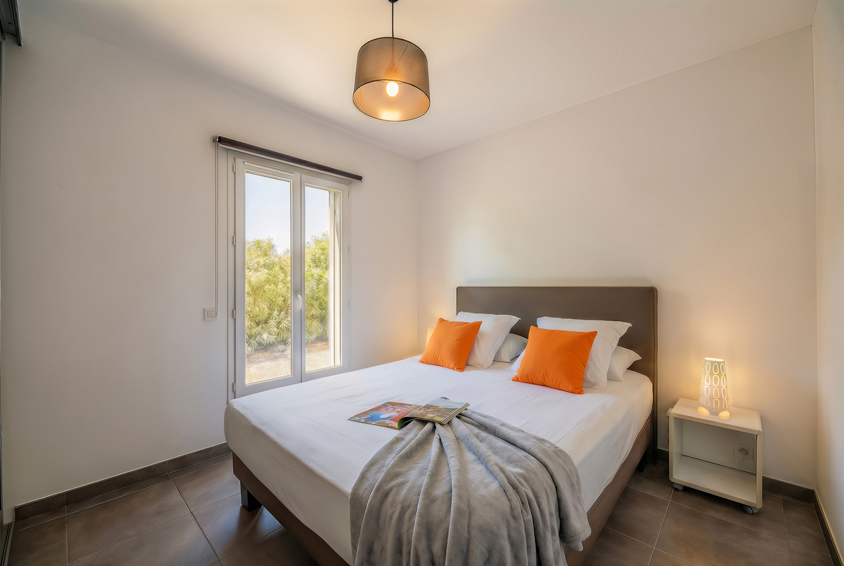 50 m² - 1 ložnice s manželskou postelí, obývací pokoj s kuchyňským koutem a rozkládacím gaučem pro 2 osoby (možno i typ "šuplík"), sociální zařízení se sprchou, prostorná terasa (30 m²) s grilem a s výhledem na bazén