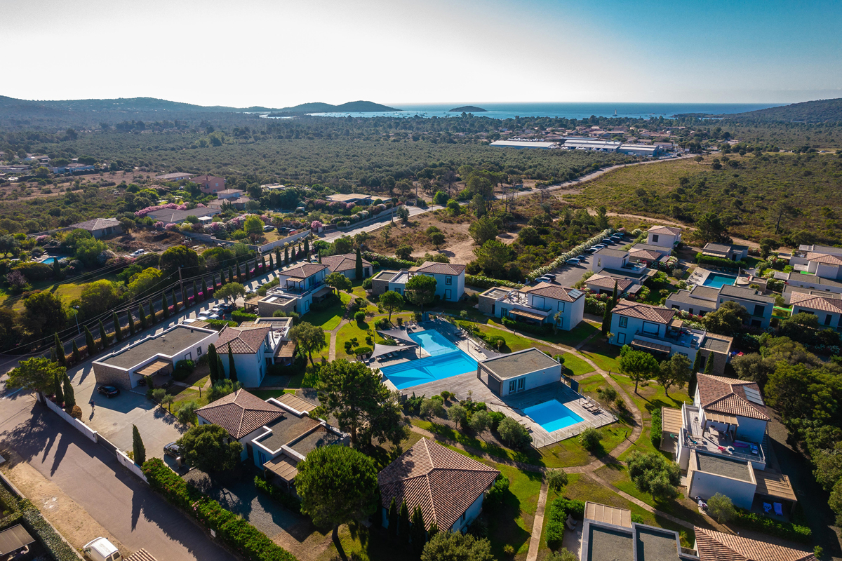 Komplex menších domků s prostornými apartmány obklopující bazény.