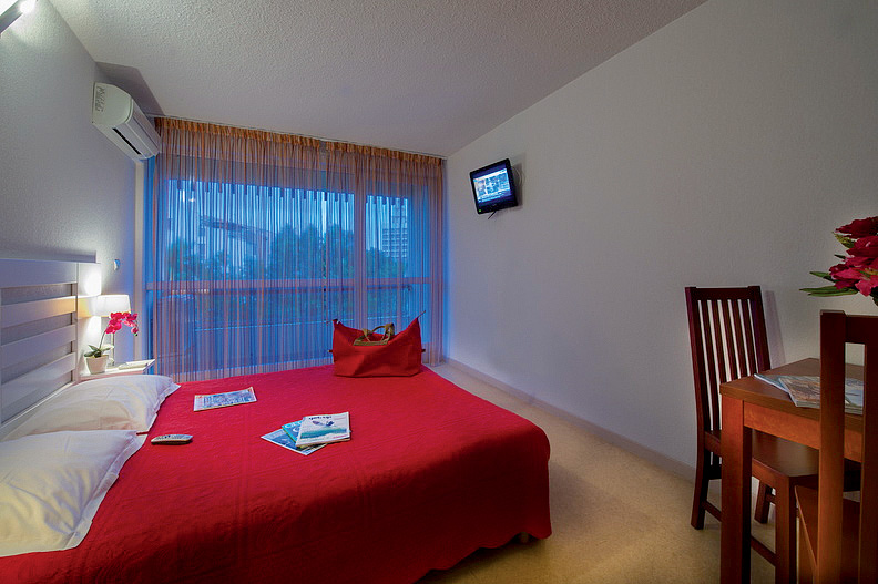 19 m² - obývací pokoj s kuchyňským koutem a rozkládacím gaučem pro 2 osoby (možno i typ "šuplík"), sociální zařízení se sprchou či vanou, balkon S VÝHLEDEM NA BAZÉN