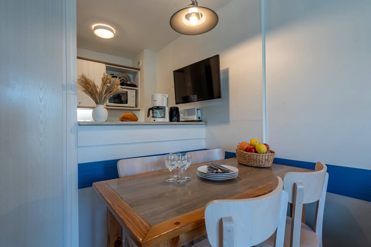 30 m² - 1 ložnice se 2 samostatnými lůžky a 1 sklopným lůžkem, obývací pokoj s kuchyňským koutem a rozkládacím gaučem (typ šuplík), 1 sociální zařízení, terasa